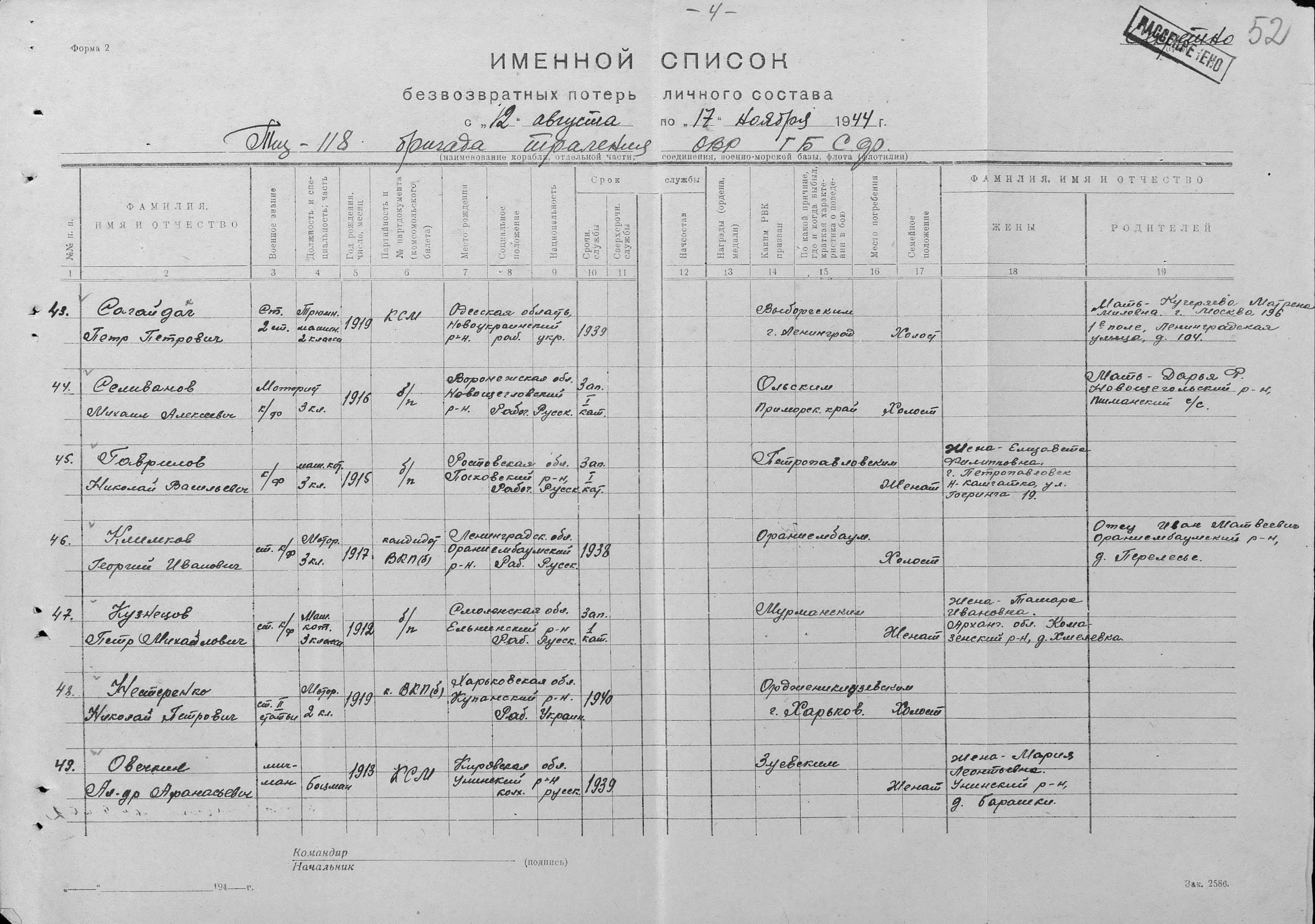 Донесение о безвозвратных потерях исх 02196 от 21.10.1944 (ЦВМА, Ф. 4038, О. 54, Д. 23).
