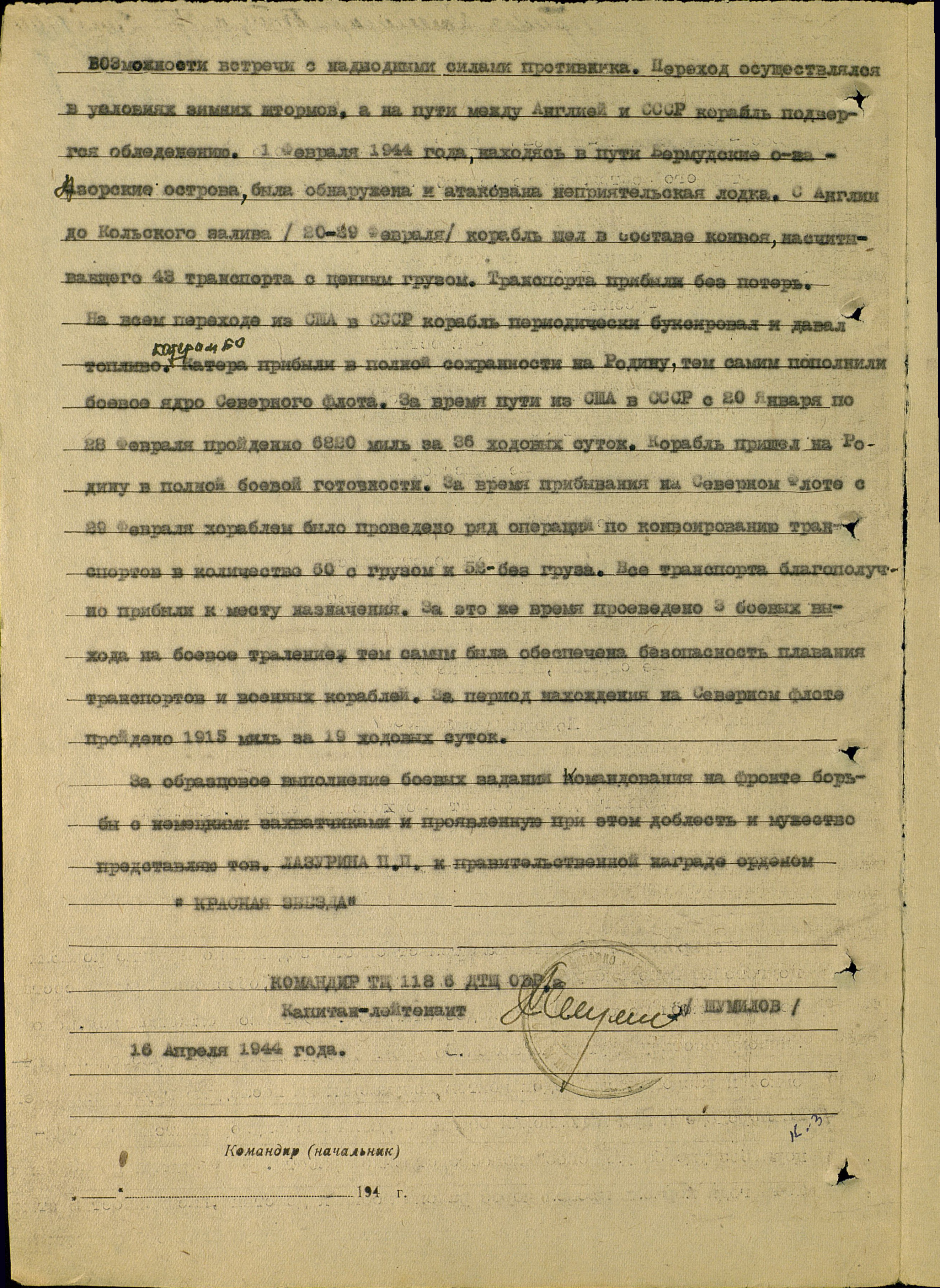За образцовое выполнение боевых заданий командования на фронте борьбы с немецкими захватчиками и проявленные при этом доблесть и мужество представляю тов. Лазурина П.П. к правительственной награде – ордену Красной Звезды.