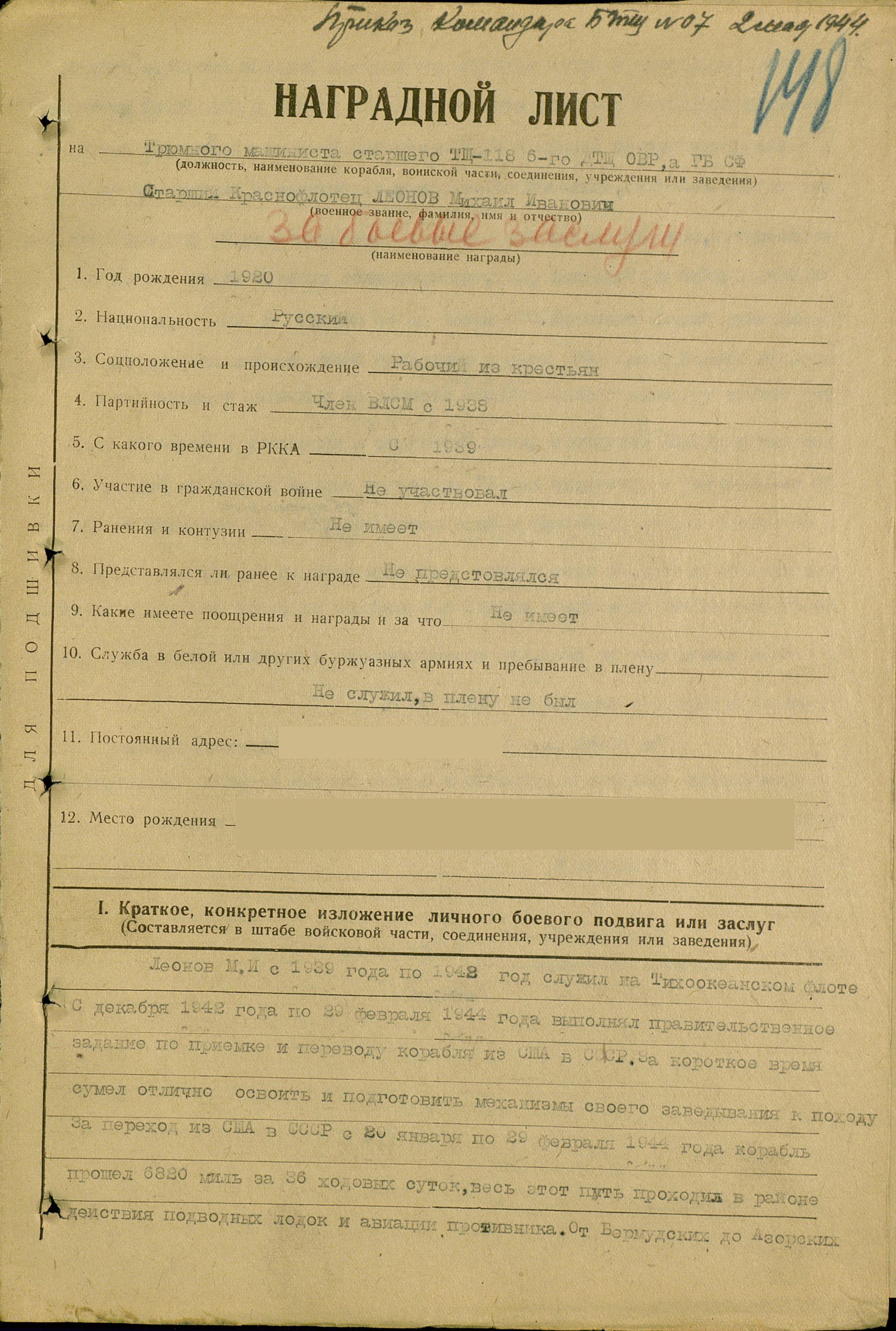 Леонов Михаил Иванович, воинское звание – краснофлотец (ст. краснофлотец); должность (специальность), часть – машинист трюмный 3 кл. (ст. трюмный машинист), тральщик ТЩ-118 6 ДТЩ Бригада траления ОВР ГБ СФ; год рождения – 1918 (1920); место рождения – Московская обл., Михайловский р-н (Московская обл., д. Малинки); партийность – член ВЛКСМ с 1938 г.; социальное положение и происхождение – рабочий из крестьян; национальность – русский; срок срочной службы – 1940 (1939) г.; каким РВК призван – Ногинским РВК; награды – медаль «За боевые заслуги»; по какой причине, где и когда выбыл – погиб в море при выполнении боевого задания 12.08.1944 г.; семейное положение – холост; родственники (ФИО, адрес) – отец, Леонов Иван Петрович, г. Ногинск, Глухово, казарма им. Володарского, д. 17, кв. 63; дополнительная информация –с 1939 г. по 1943 г. служил на ТОФ, с 12.1942 г. по 29.02.1944 г. выполнял правительственное задание по приемке и по переводу корабля из США в СССР.