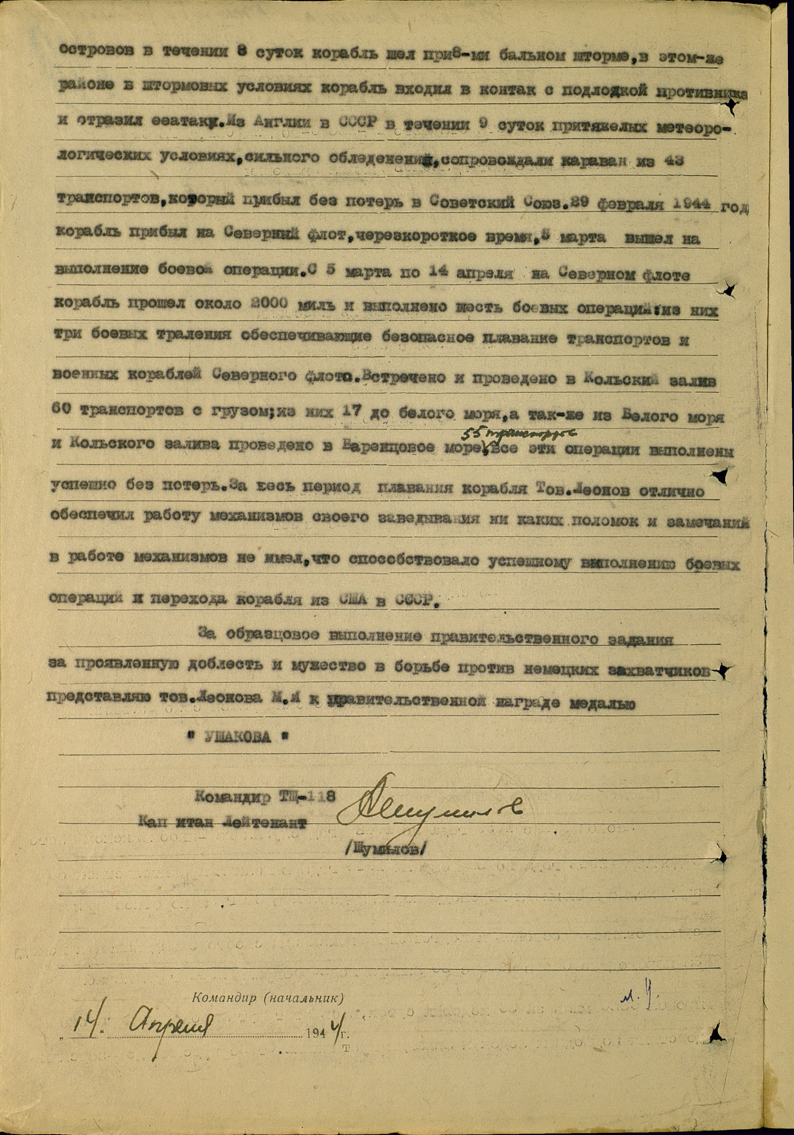 За образцовое выполнение правительственного задания, за проявленные доблесть и мужество в борьбе против немецких захватчиков представляю тов. Леонова М.И. к правительственной награде – медали Ушакова.