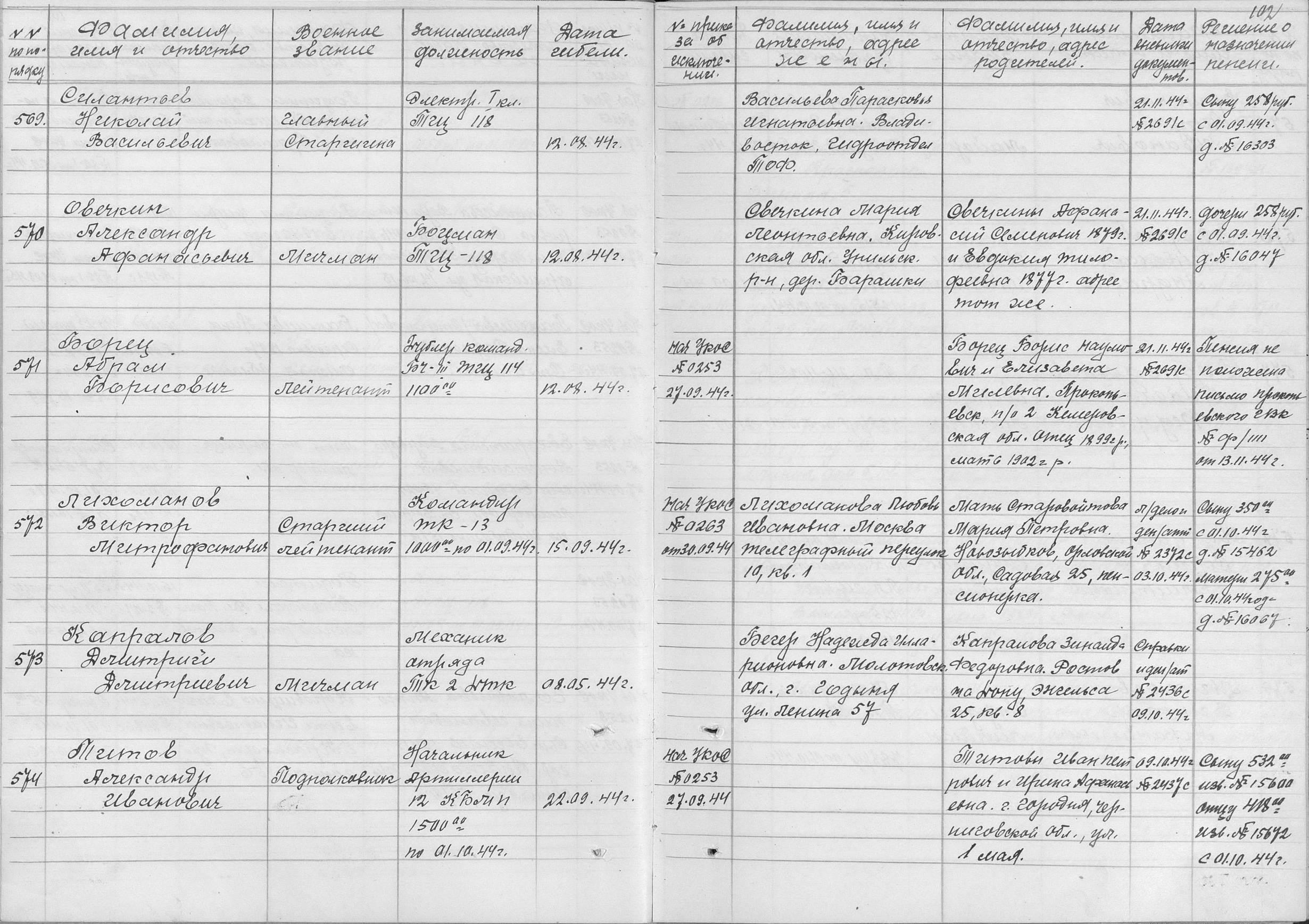 Книга учета безвозвратных потерь начсостава за Отечественную войну Командный отдел СФ (ЦВМА, Ф. 691, О. 1, Д. 4).