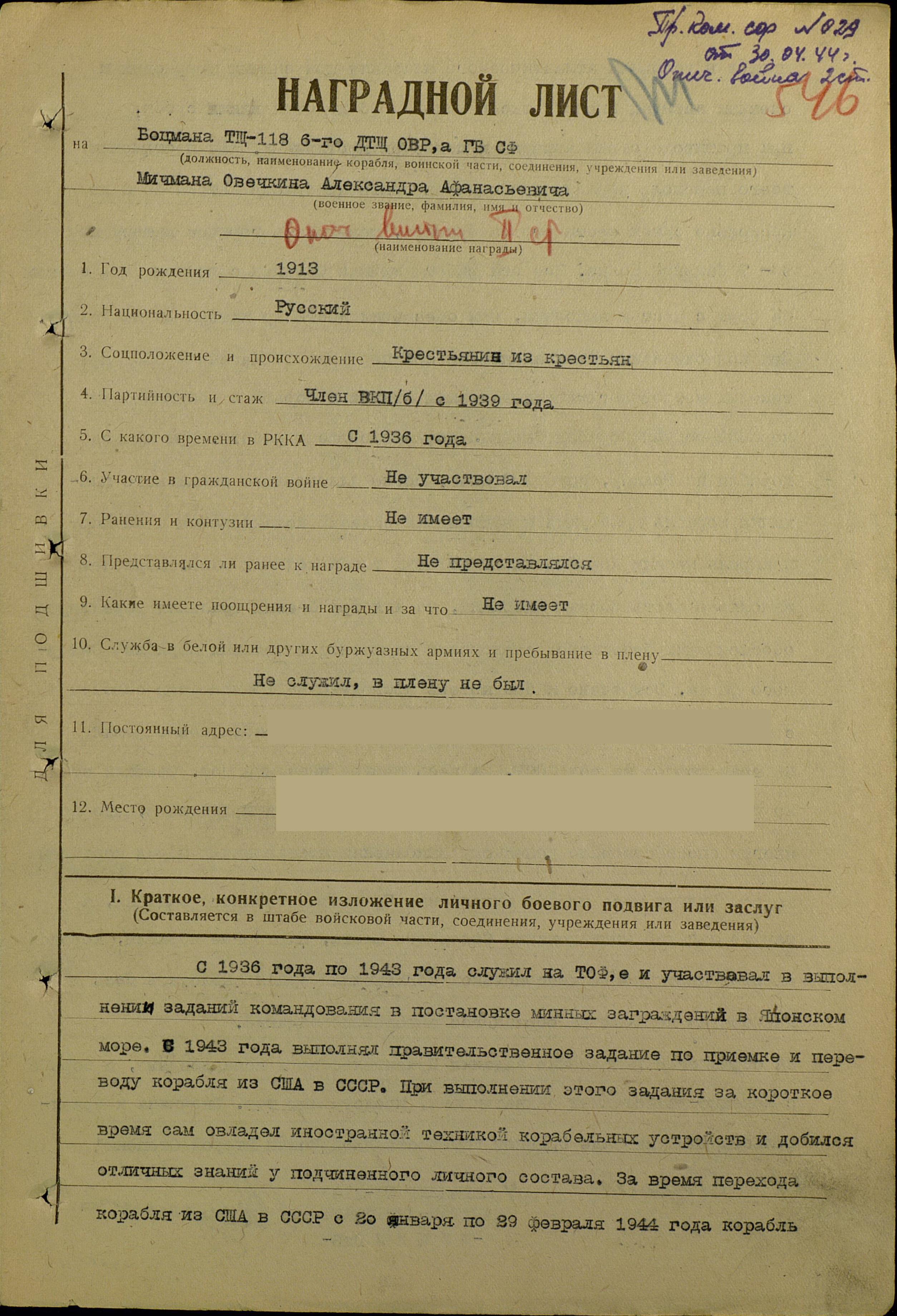 Наградной лист.