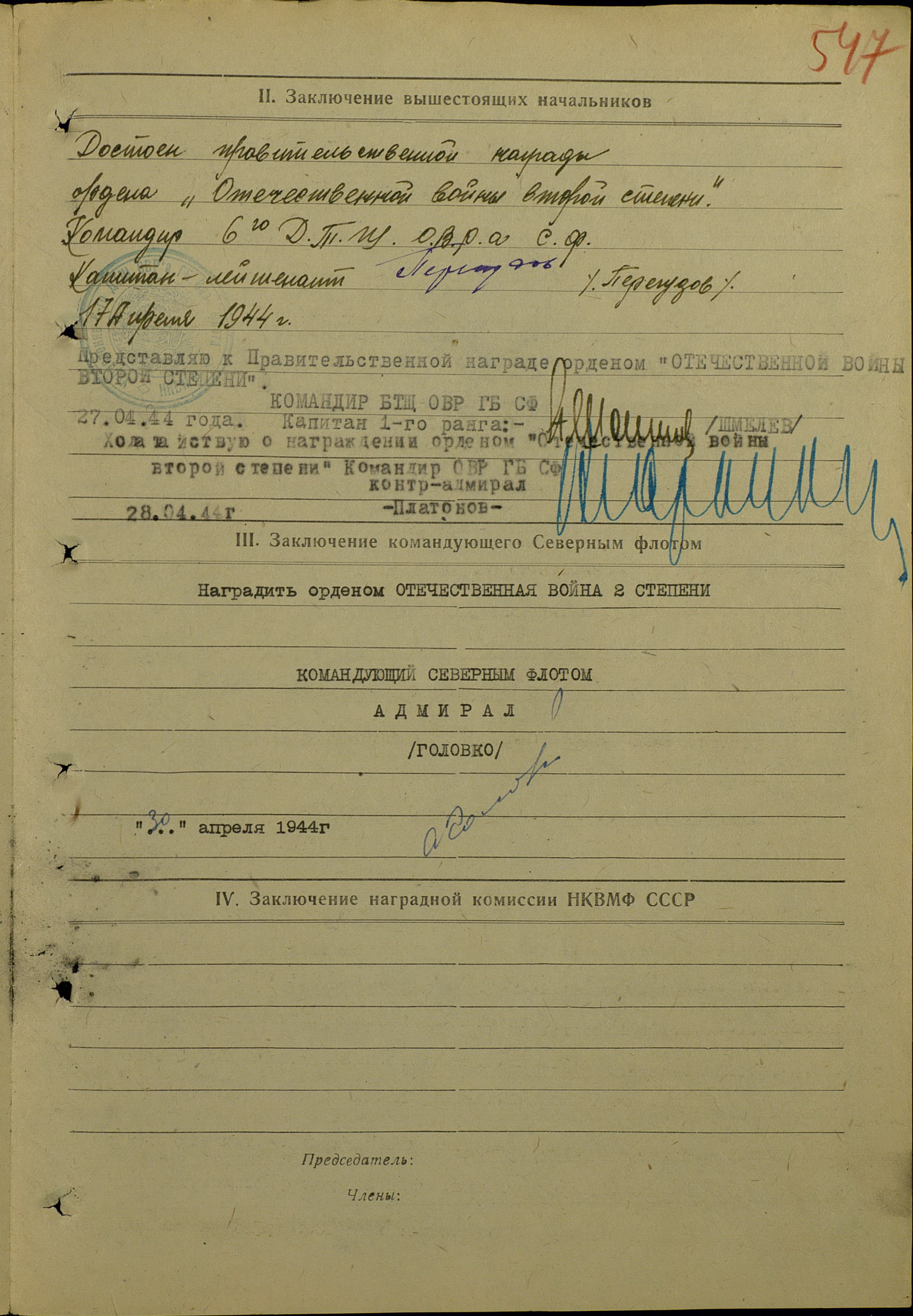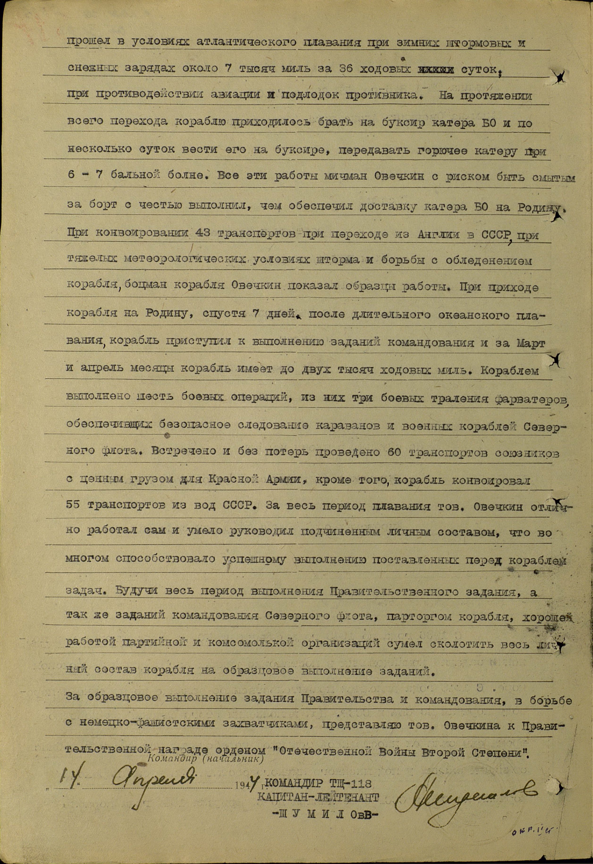 За образцовое выполнение задания правительства и командования в борьбе с немецко-фашистскими захватчиками представляю тов. Овечкина к правительственной награде – ордену Отечественной войны II степени.