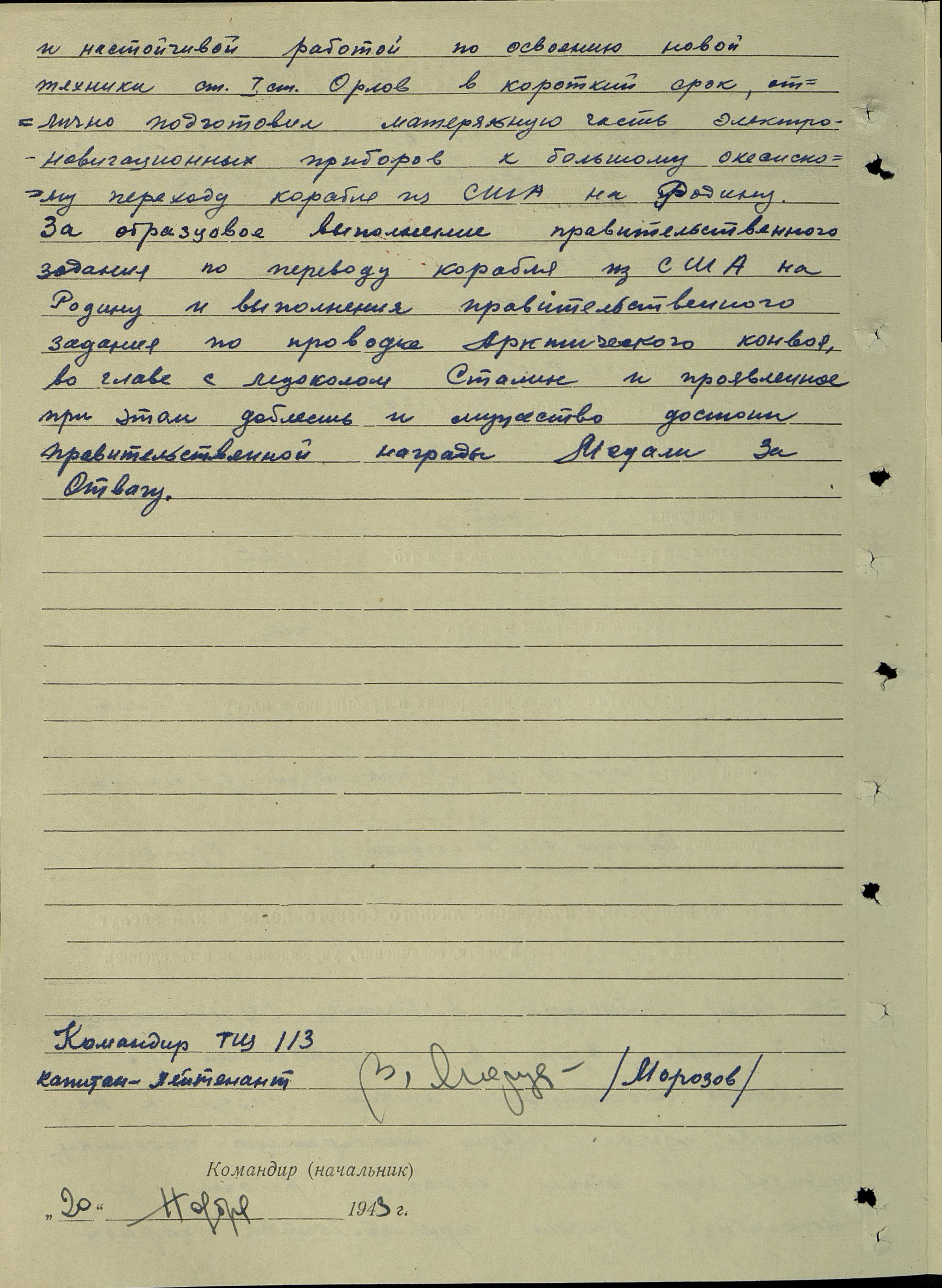 За время пребывания в команде ТЩ-113 старшина 1 статьи Орлов С.А. в кратчайший срок, не владея иностранным языком, упорно и настойчиво изучал новую иностранную технику, показав при этом образцы работы для выполнения задания правительства. Упорной и настойчивой работой по освоению новой техники старшина 1 статьи Орлов в короткий срок отлично подготовил материальную часть электронавигационных приборов к большому океанскому переходу корабля из США на Родину.