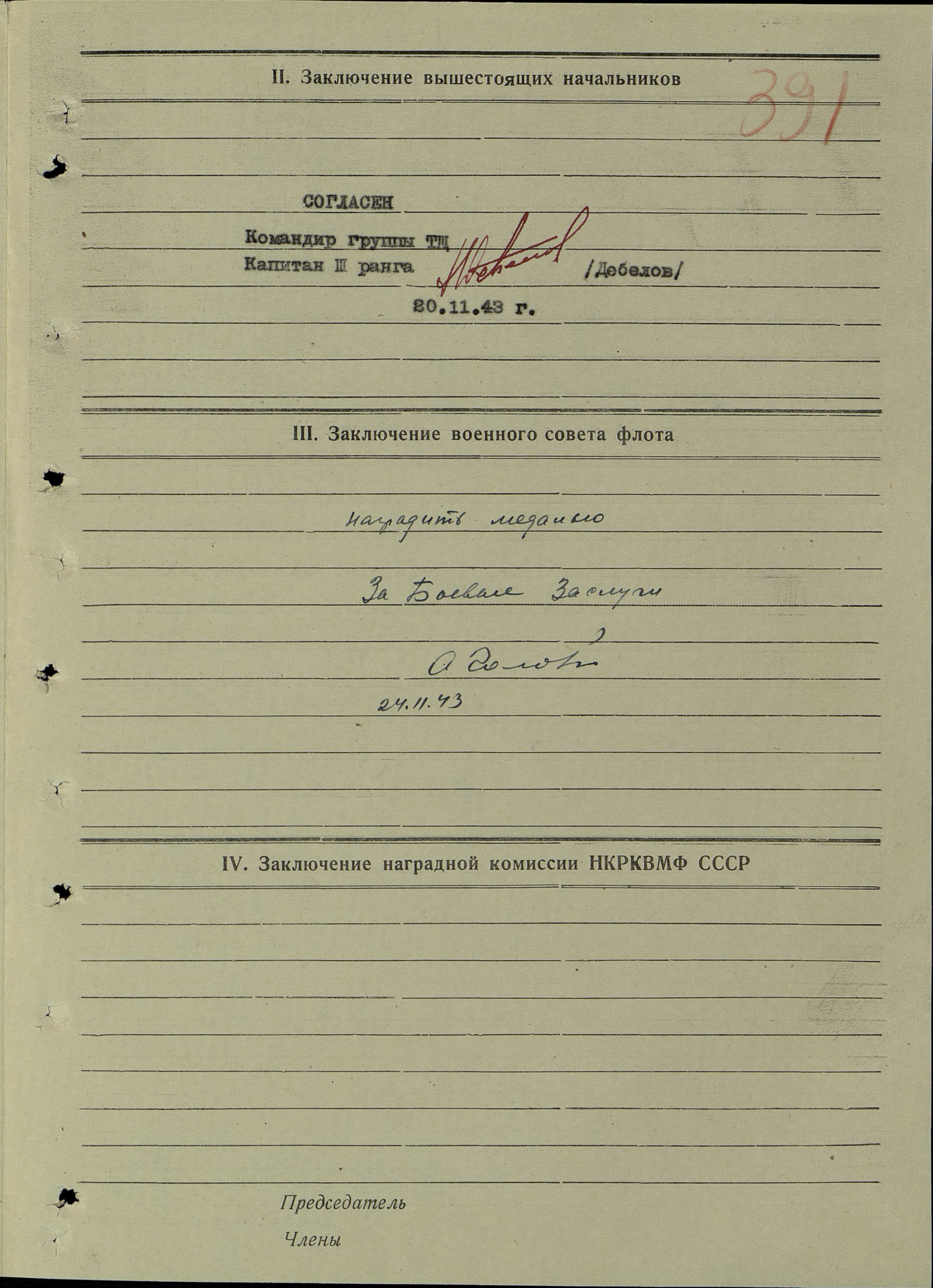 За образцовое выполнение правительственного задания по переводу корабля из США на Родину и выполнения правительственного задания по проводке арктического конвоя во главе с ледоколом «И. Сталин», и проявленное при этом доблесть и мужество достоин правительственной награды медали «За отвагу».
