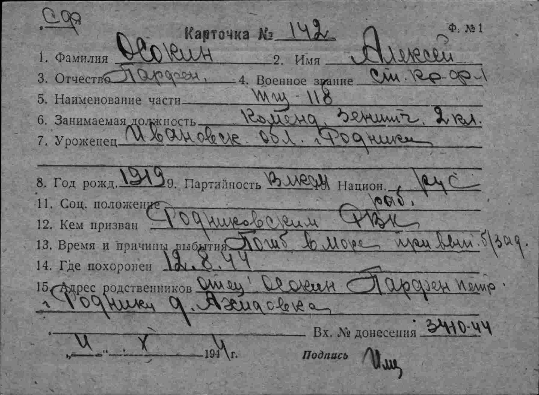 Донесение о безвозвратных потерях 3410 от 03.10.1944 (ЦВМА, Ф. 864, О. 1, Д. 1358).