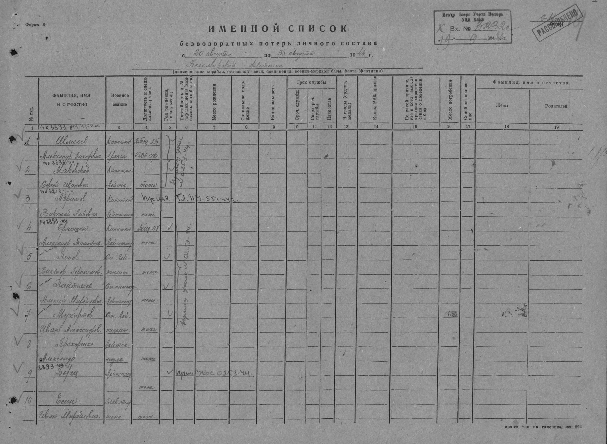 Донесение о безвозвратных потерях 3232 от 19.09.1944 (ЦВМА, Ф. 864, О. 1, Д. 1342).