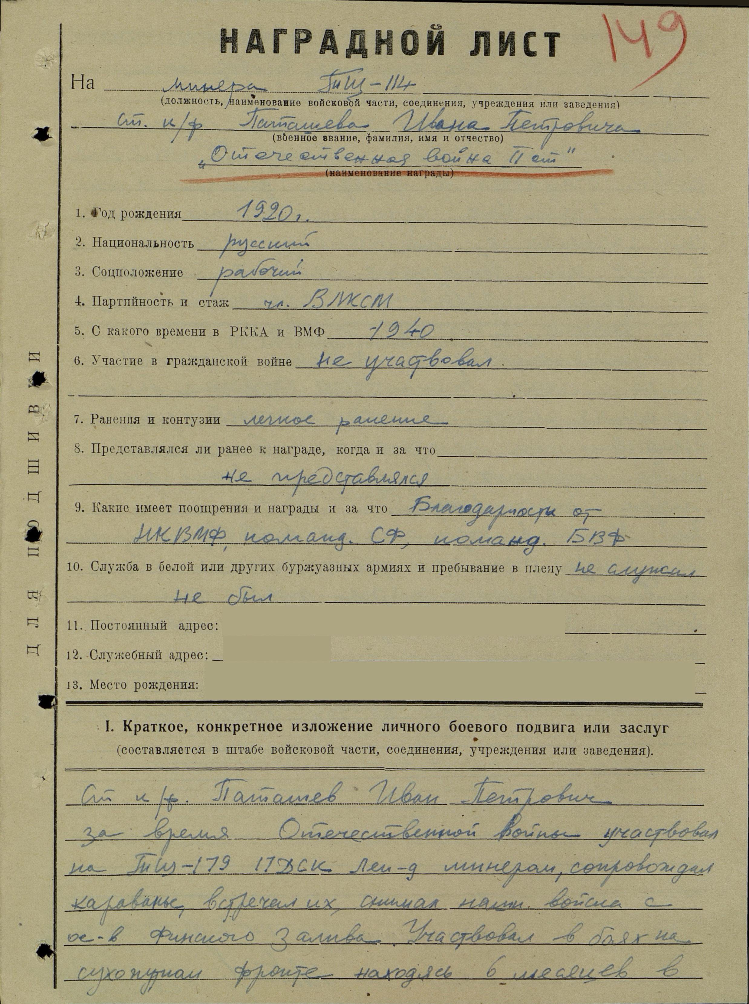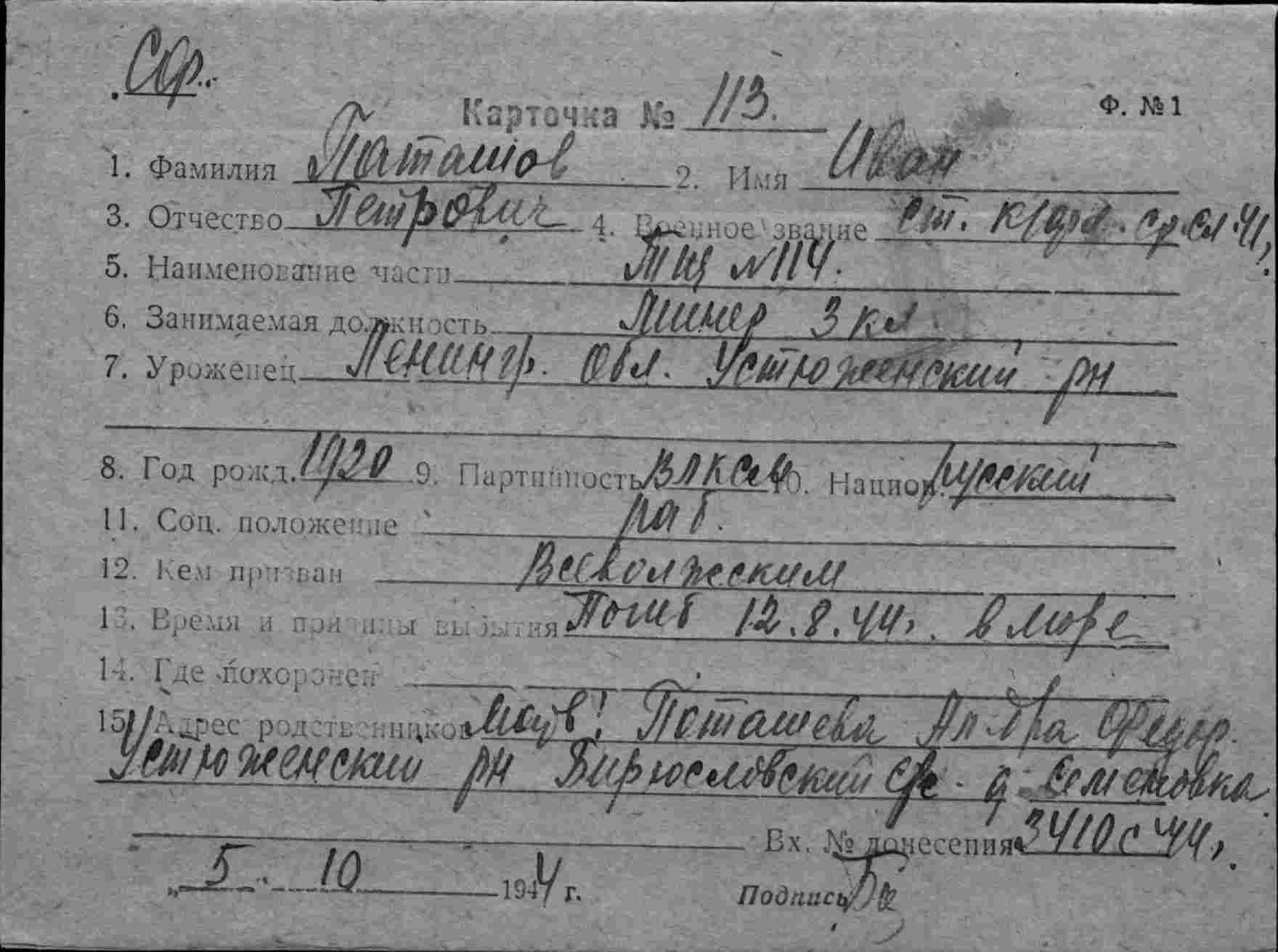Паташев (Поташов) Иван Петрович, воинское звание – ст. краснофлотец; должность (специальность), часть – минер 3 кл., тральщик ТЩ-114 6 ДТЩ Бригада траления ОВР ГБ СФ; год рождения – 1920; место рождения – Ленинградская обл., Устюженский р-н; партийность – член ВЛКСМ; социальное положение – рабочий; национальность – русский; срок срочной службы – 1940 (1941) г.; каким РВК призван – Всеволжским РВК; награды – орден Отечественной войны II степени; по какой причине, где и когда выбыл – погиб в море при выполнении боевого задания 12.08.1944 г.; семейное положение – холост; родственники (ФИО, адрес) – мать, Поташева Александра Федоровна, Устюженский р-н, Бирюсловский с/с, д. Семеновка; дополнительная информация – имел благодарности от НК ВМФ, командующего СФ, командующего БВФ, 22.06. был ранен, служил на ТЩ-179 17 ДСК Лен-д (Ленинград – ?) минером, участвовал в боях на сухопутном фронте, находясь 6 месяцев в дозоре на льду Финского залива, участвовал во всех операциях, проводимых КТЩ-29 1 ДКТЩ, Ленинград, участвовал в высадке десанта в районе реки Тосно, участник выполнения правительственного задания по приемке и доставке кораблей из США в СССР, участник потопления двух ПЛ противника, пытавшихся атаковать ледокол «И. Сталин».