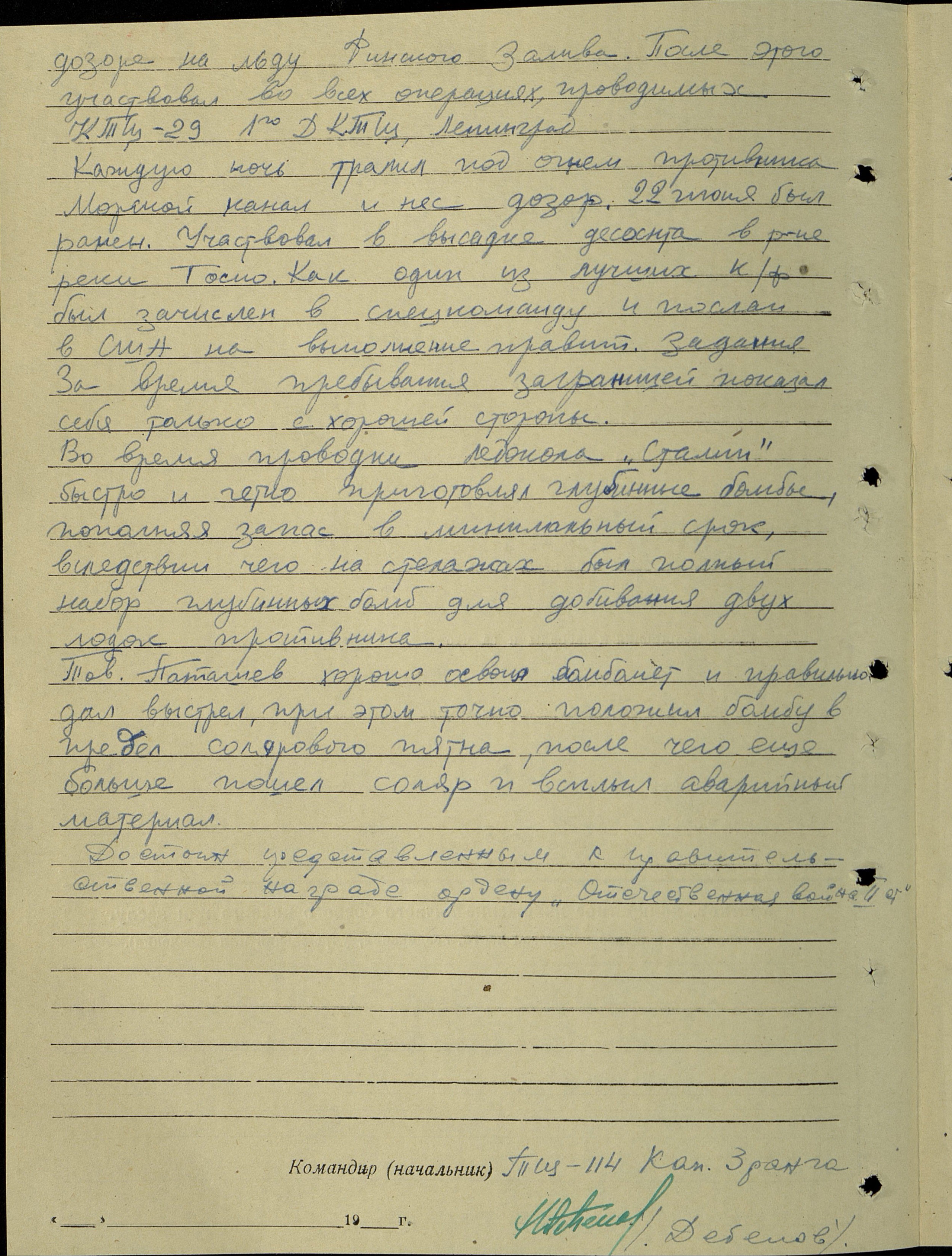 Во время проводки ледокола «И. Сталин» быстро и четко приготовлял (точнее – подготавливал) глубинные бомбы, пополняя [их] запас в минимальный срок, вследствие чего на стеллажах был полный набор глубинных бомб для добивания двух [подводных] лодок противника.