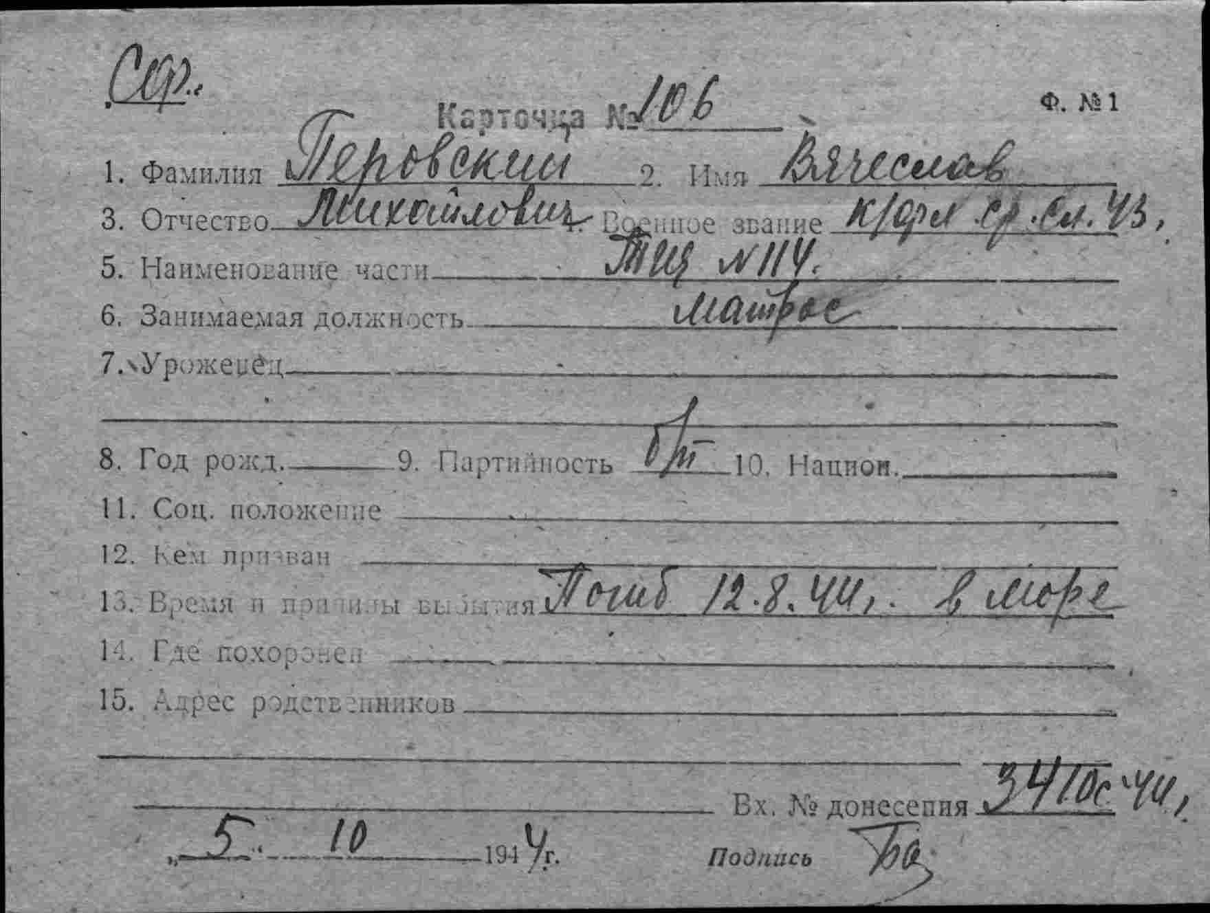 Донесение о безвозвратных потерях 3410 от 03.10.1944 (ЦВМА, Ф. 864, О. 1, Д. 1358).