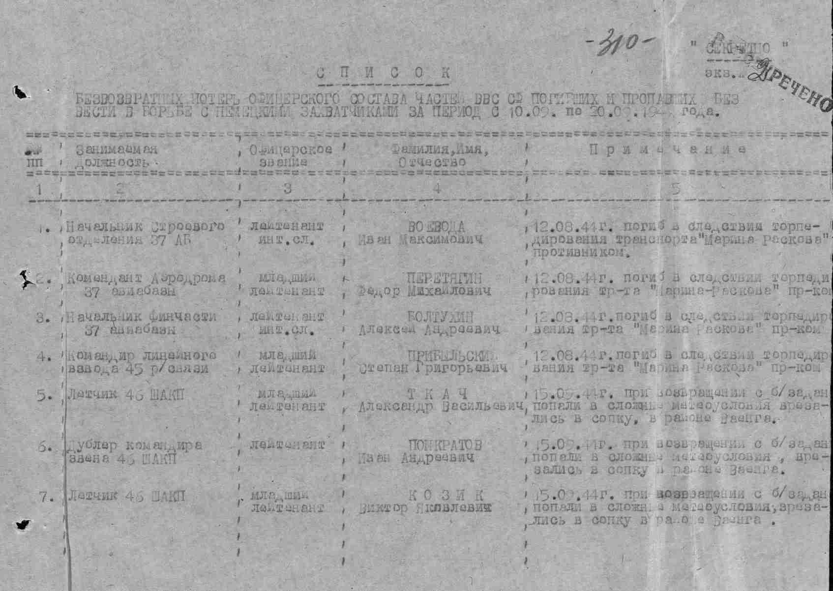 Донесение о безвозвратных потерях 3232 от 19.09.1944 (ЦВМА, Ф. 864, О. 1, Д. 1342).