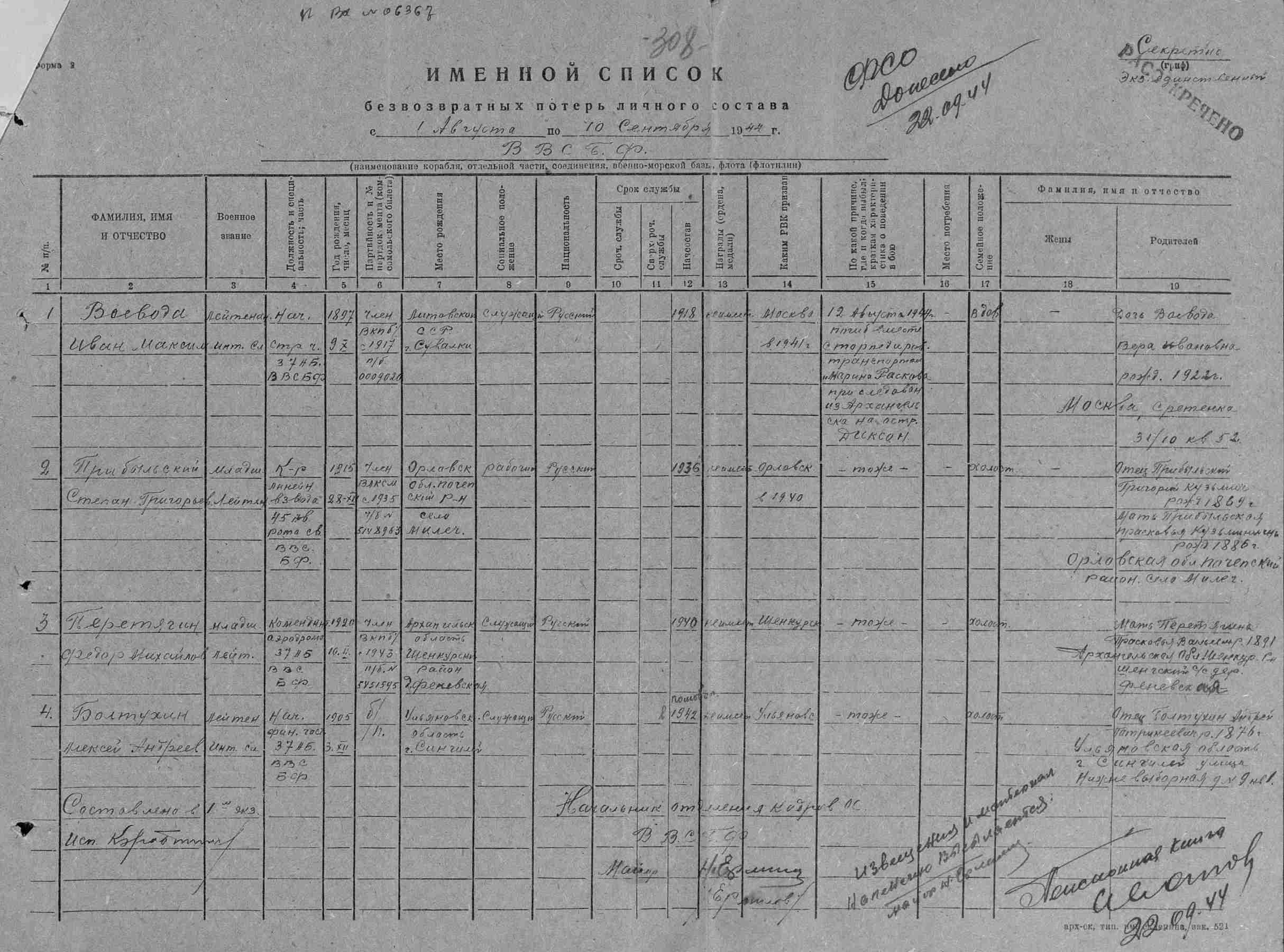 Донесение о безвозвратных потерях 2502 от 04.10.1944 (ЦВМА, Ф. 12, О. 5, Д. 234).