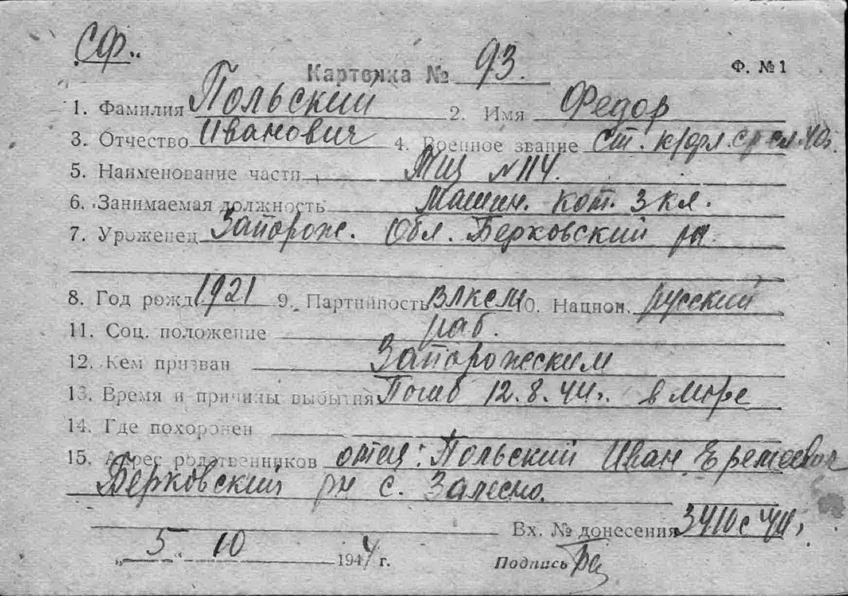 Польский Федор Иванович, воинское звание – ст. краснофлотец; должность (специальность), часть – командир отделения котельных машинистов, котельный машинист 3 кл., тральщик ТЩ-114 6 ДТЩ Бригада траления ОВР ГБ СФ; год рождения – 1921; место рождения – Запорожская обл., Берковский р-н; партийность – член ВЛКСМ