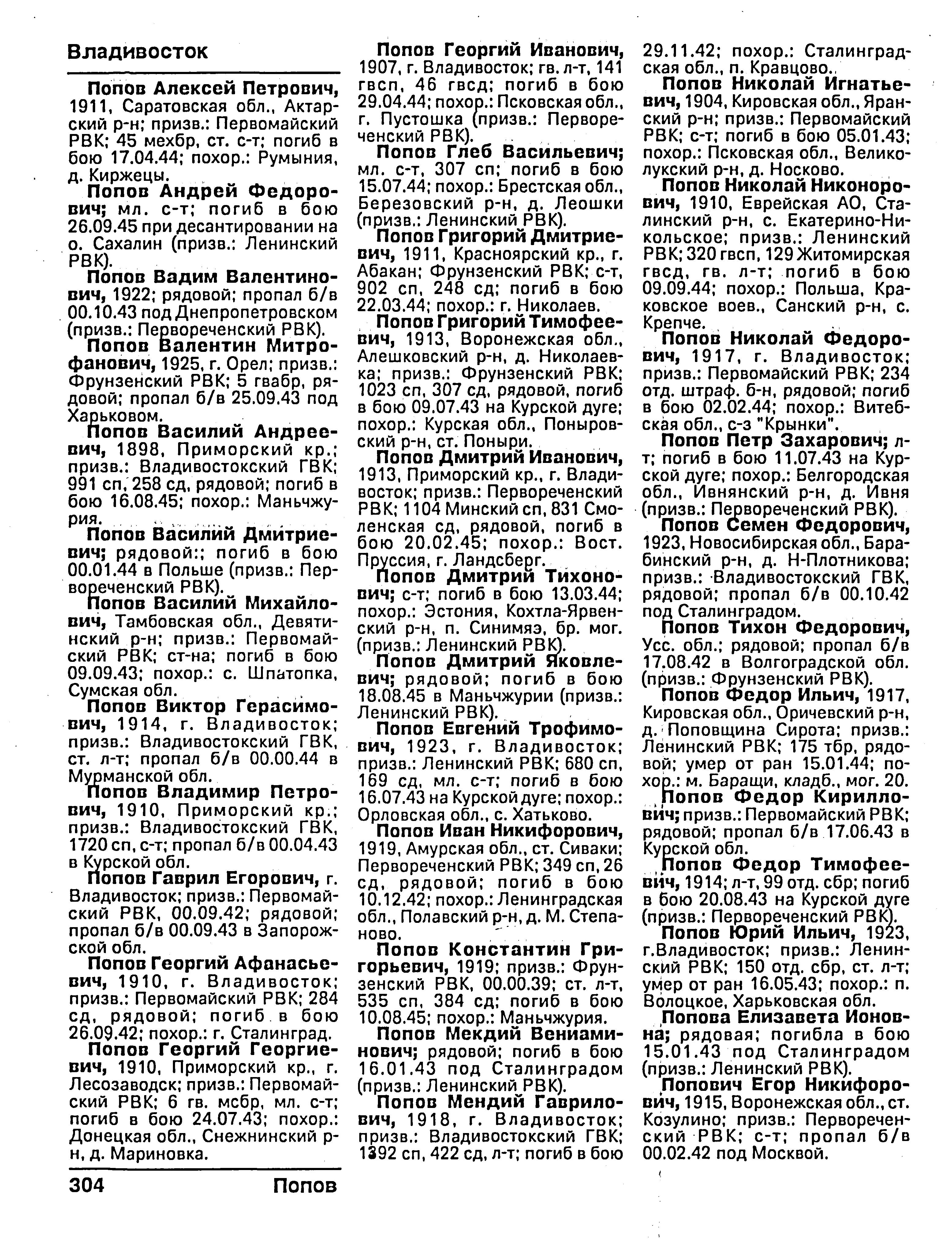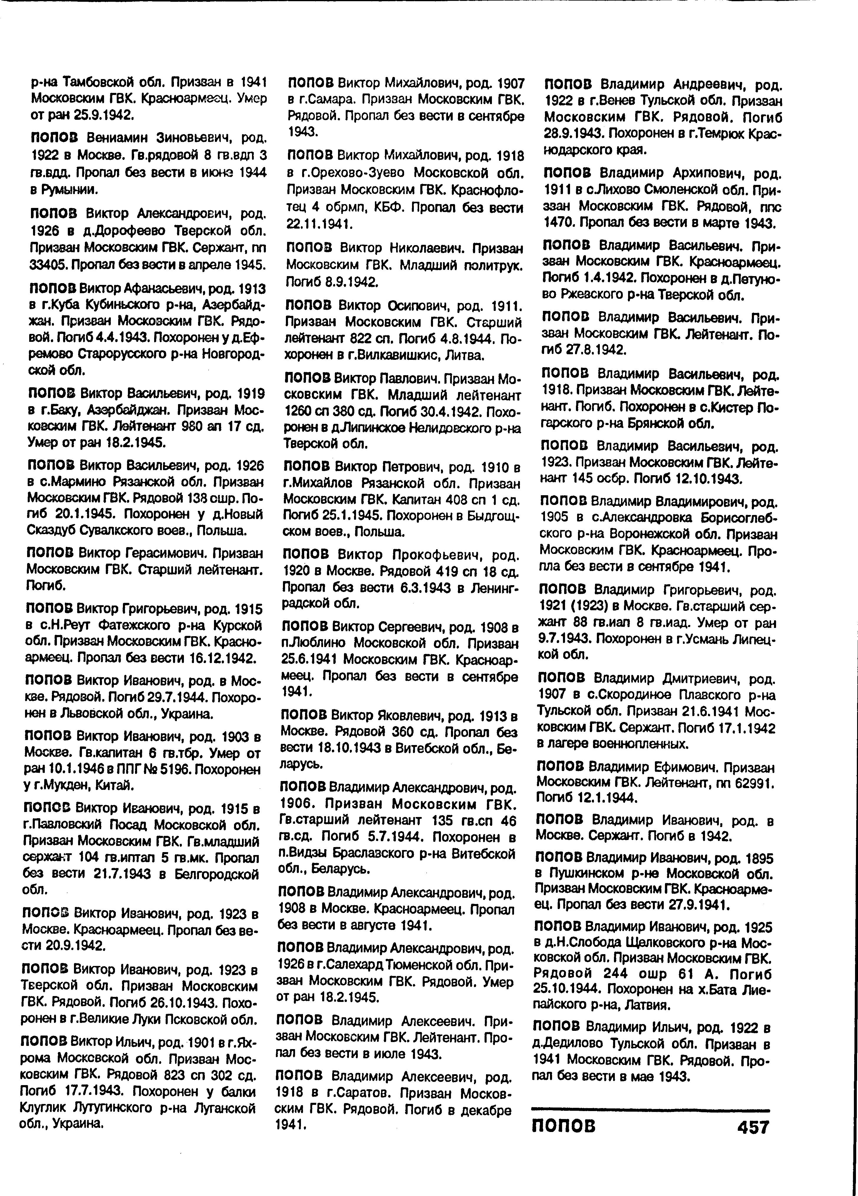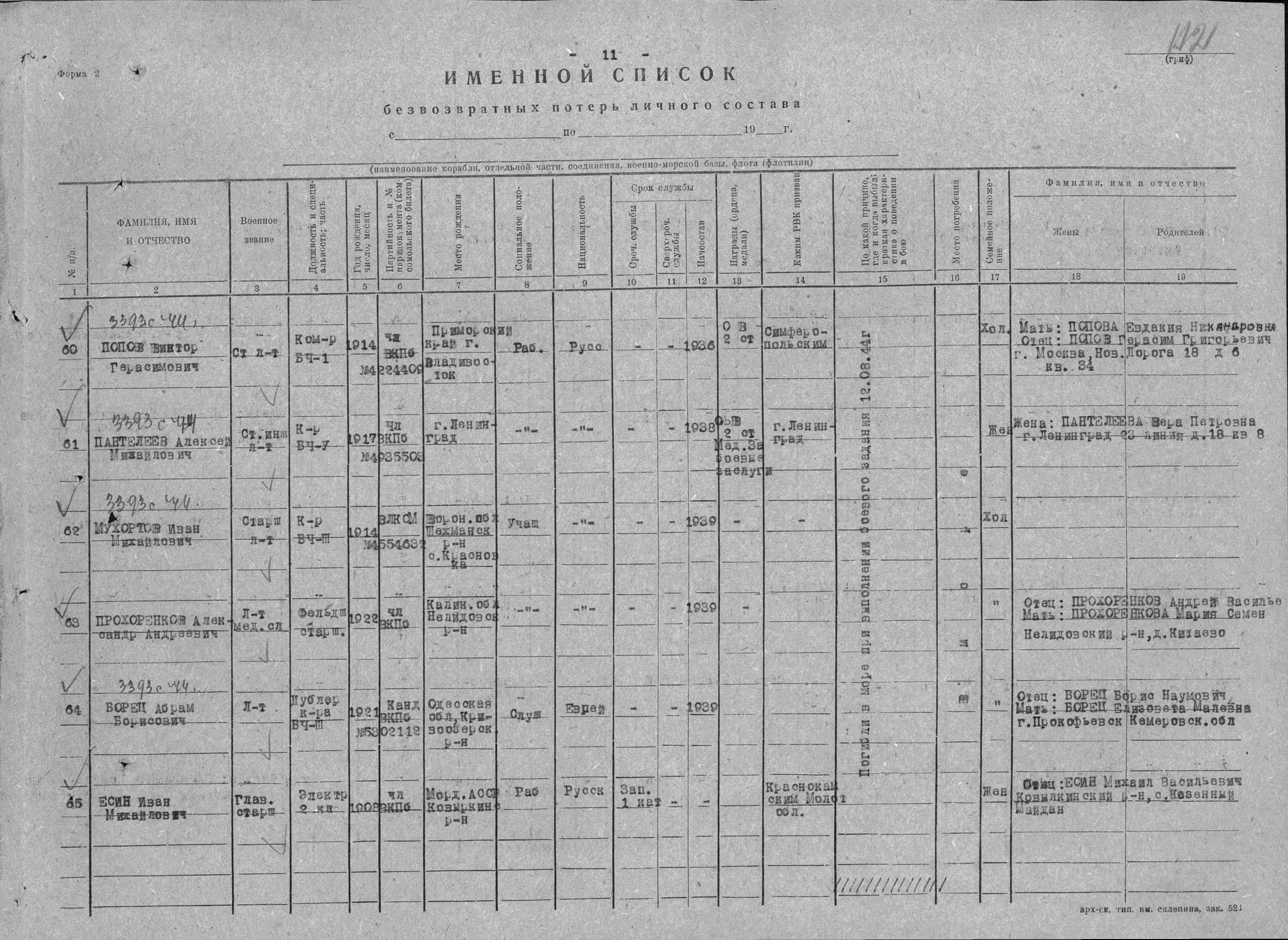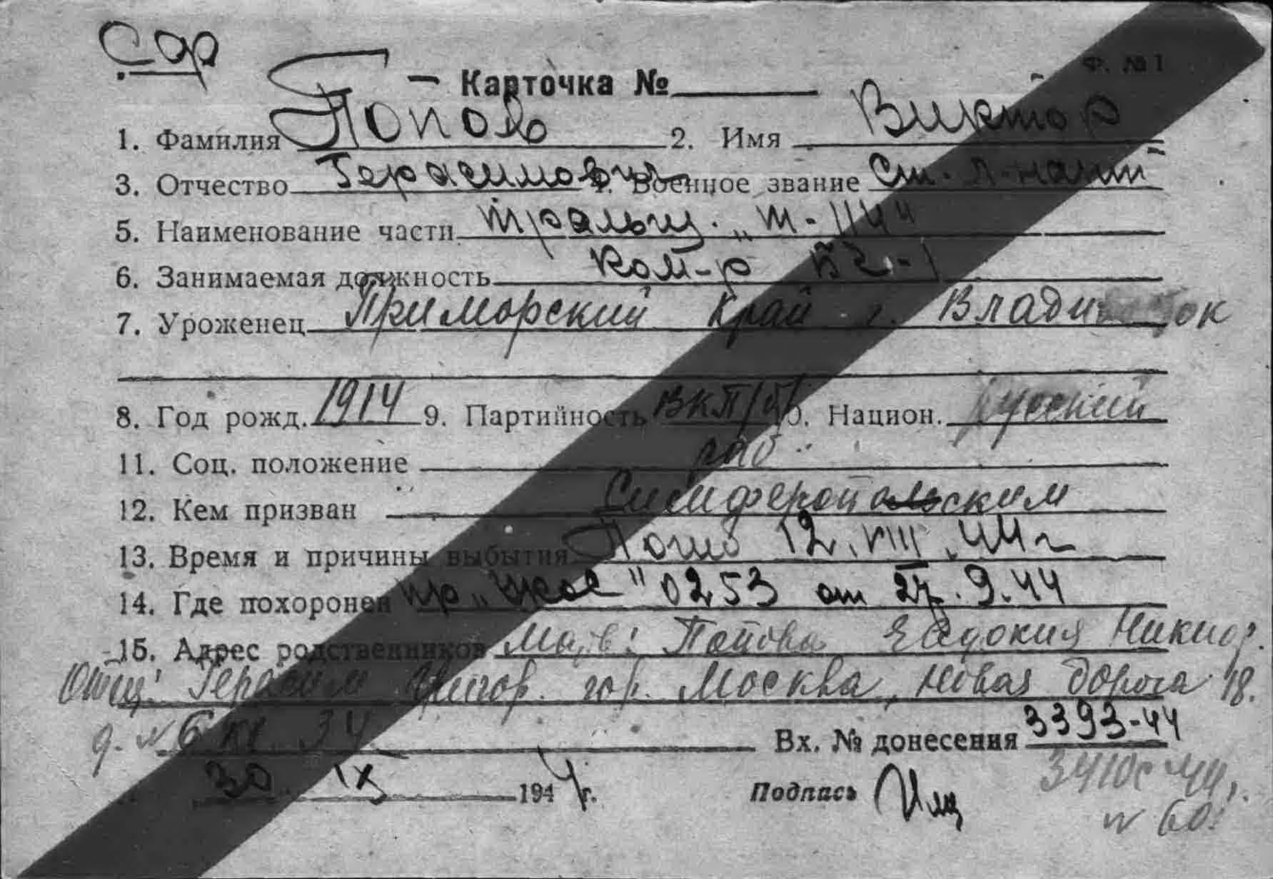 Попов Виктор Герасимович, воинское звание – ст. лейтенант (лейтенант); должность (специальность), часть – командир БЧ-1, тральщик ТЩ-114 6 ДТЩ Бригада траления ОВР ГБ СФ (командир БЧ-1-4, ТЩ-115 ОВР ГБ СФ); год рождения – 1914; место рождения – Приморский край, г. Владивосток; партийность и № партдокумента – член ВКП (б) с 1941 г., № 4224409 (4224400); социальное положение и происхождение – рабочий из крестьян; национальность – русский; срок службы (начсостав) – 1936 г.; награды – орден Отечественной войны II степени; каким РВК призван – Симферопольским; по какой причине, где и когда выбыл – погиб в море при выполнении боевого задания 12.08.1944 г.; семейное положение – холост; родственники (ФИО; адрес) – мать, Попова Евдокия Никандровна (Никаноровна, Никифоровна), отец, Попов Герасим Григорьевич; г. Москва, Новая дорога 18, д. (бар.) 6, кв. (комн.) 34; дополнительная информация – имел поощрение от наркома ВМФ, участвовал в выполнении правительственного задания по приемке и проводке кораблей из США на Родину, участвовал в операции по проводке п/х «Дежнева» в Югорский шар, имевшей целью оттянуть на себя внимание (?).