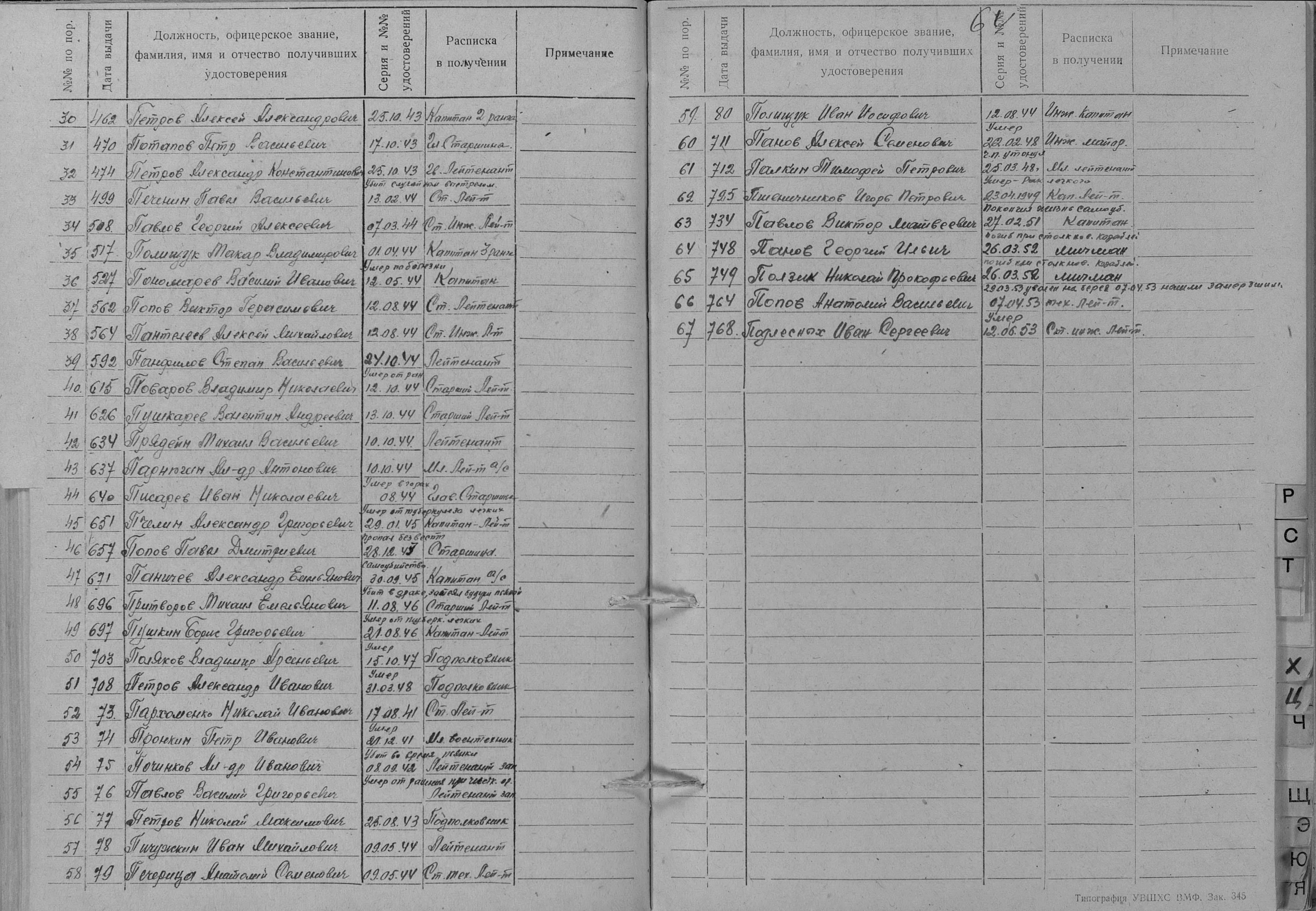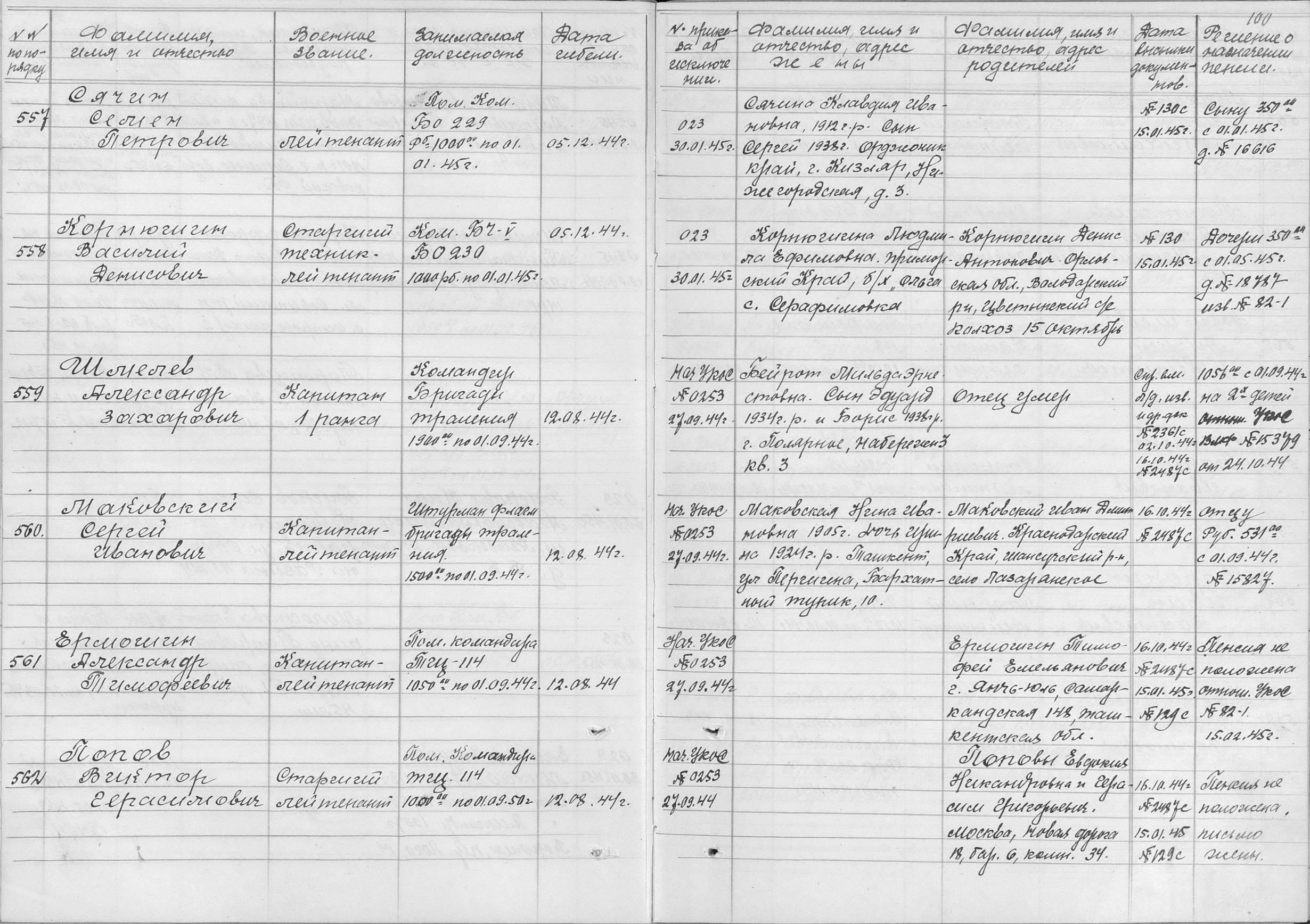 Книга учета безвозвратных потерь начсостава за Отечественную войну Командный отдел СФ (ЦВМА, Ф. 691, О. 1, Д. 4).