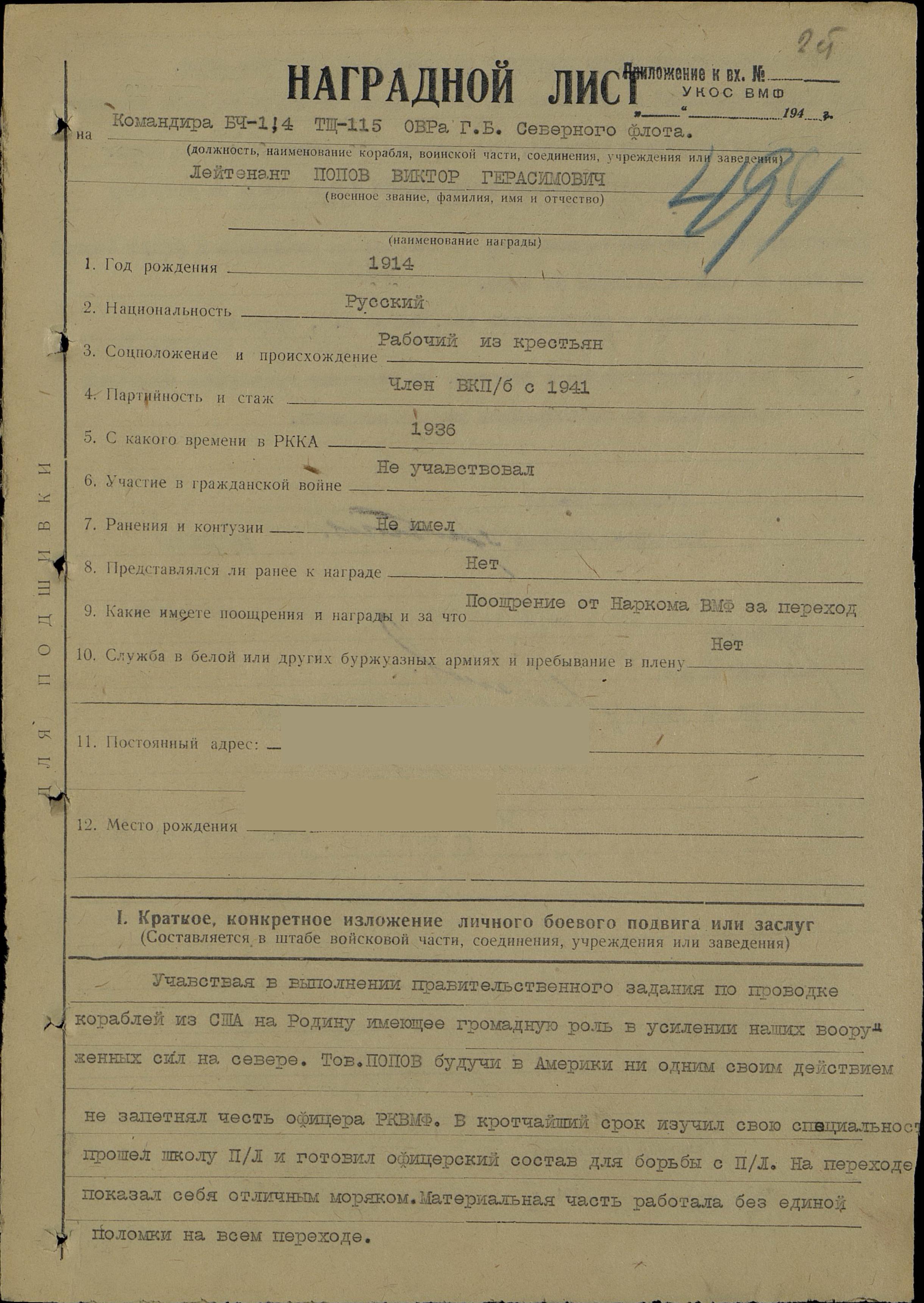 Участвовал в выполнении правительственного задания по проводке кораблей из США на Родину, имеющей громадную роль в усилении наших вооруженных сил на Севере. Тов. Попов, будучи в Америке, ни одним своим действием не запятнал честь офицера РК ВМФ. В кротчайший срок изучил свою специальность, прошел школу ПЛ и готовил офицерский состав для борьбы с ПЛ. На переходе показал себя отличным моряком. Материальная часть работала без единой поломки на всем переходе. Участвовал в операции по проводке ледоколов из Карского моря. Проводкой «Дежнева» в Югорский шар имели целью оттянуть на себя внимание, эта операция выполнена успешно, хотя штурман был впервые в этом море. Участвовал в проводке караванов транспортов и при атаке на подлодку противника, где (?) являлся управляющим по ПЛО, был на рекордере и успех боевой операции во многом зависел от него.
