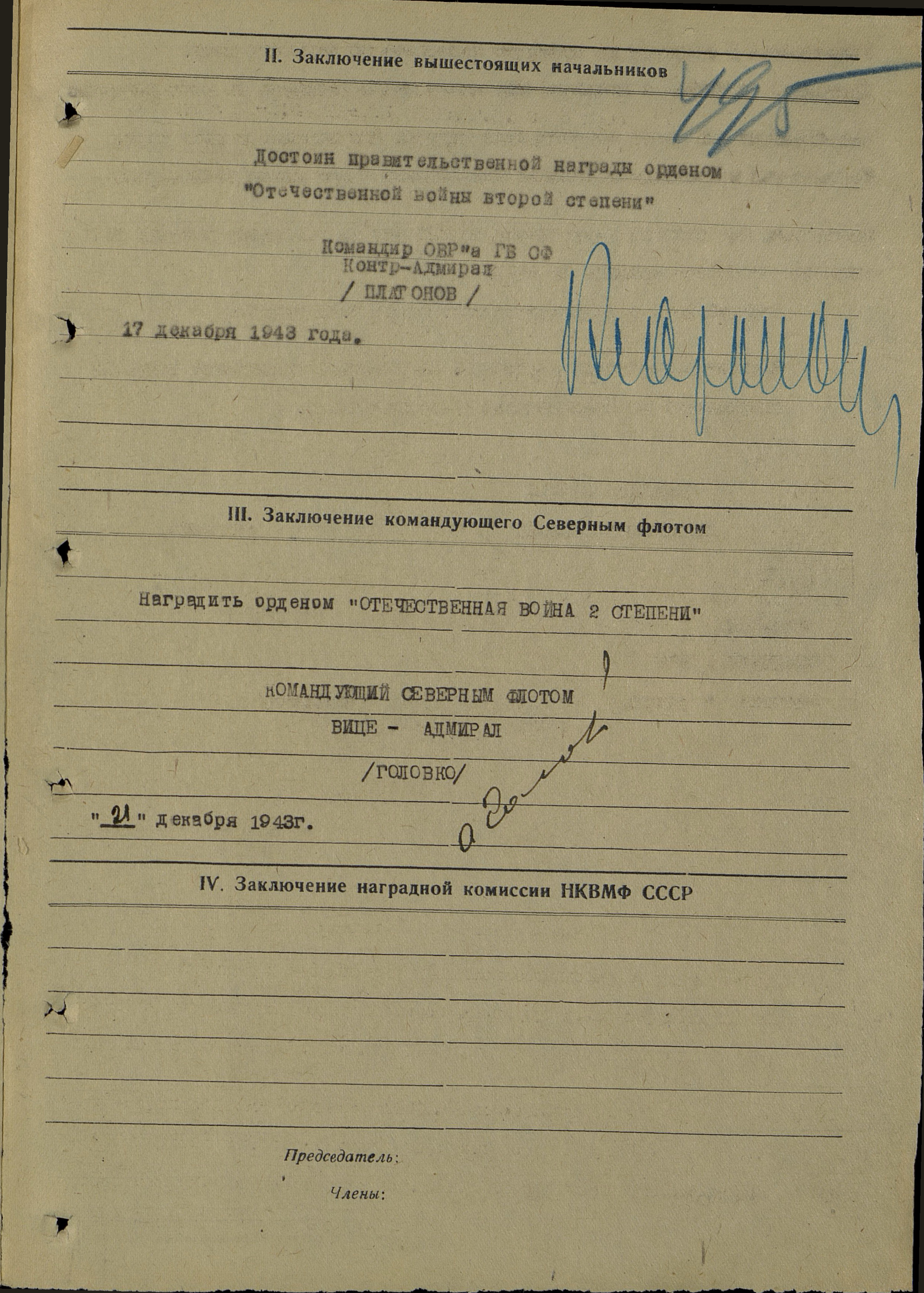 Ходатайствую о награждении тов. Попова В.Г. орденом Отечественной войны I степени за успешно проводимые операции, основываясь на безаварийном кораблевождении.