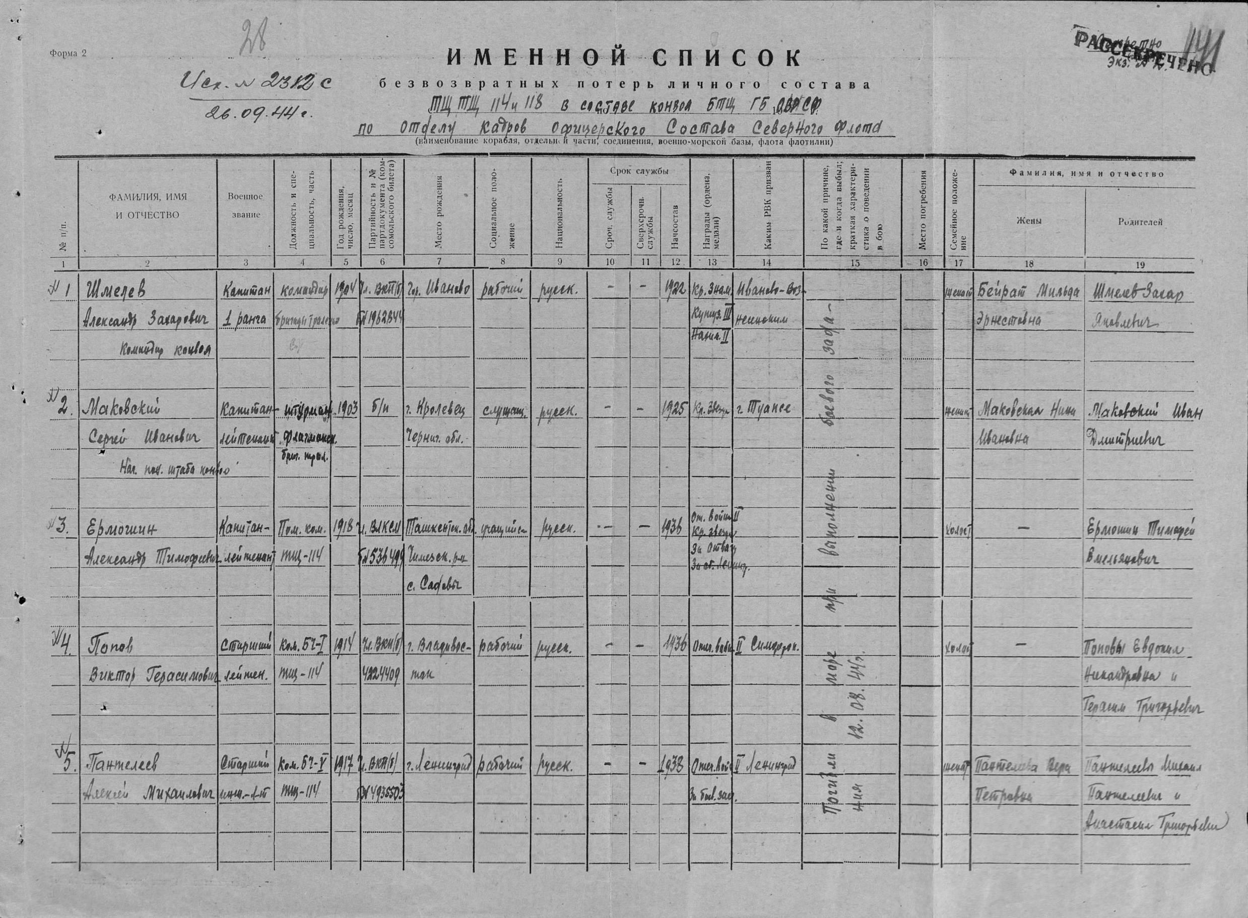 Донесение о безвозвратных потерях 2312 от 26.09.1944 (ЦВМА, Ф. 691, О. 1, Д. 12).