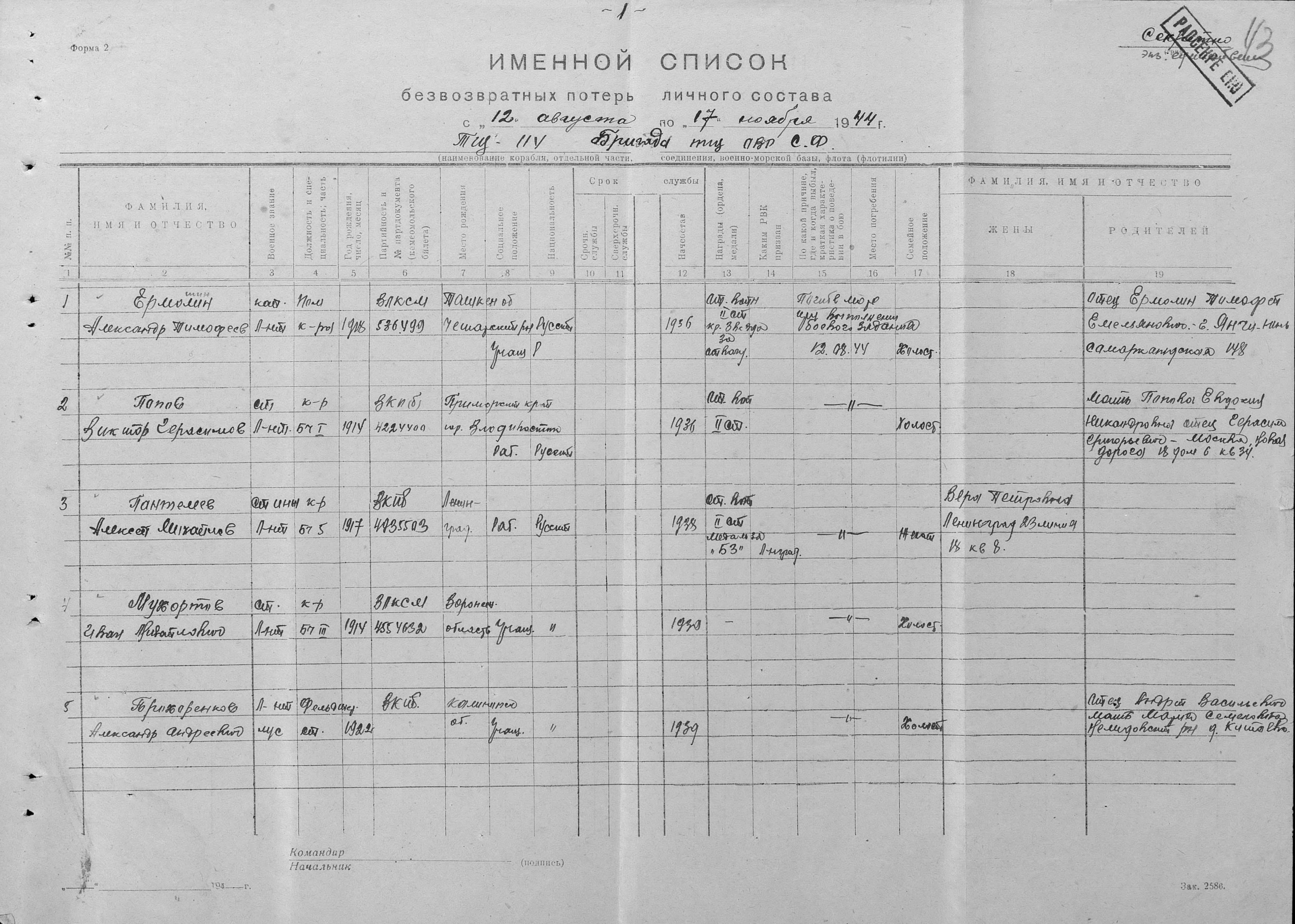 Донесение о безвозвратных потерях 3232 от 19.09.1944 (ЦВМА, Ф. 864, О. 1, Д. 1342).