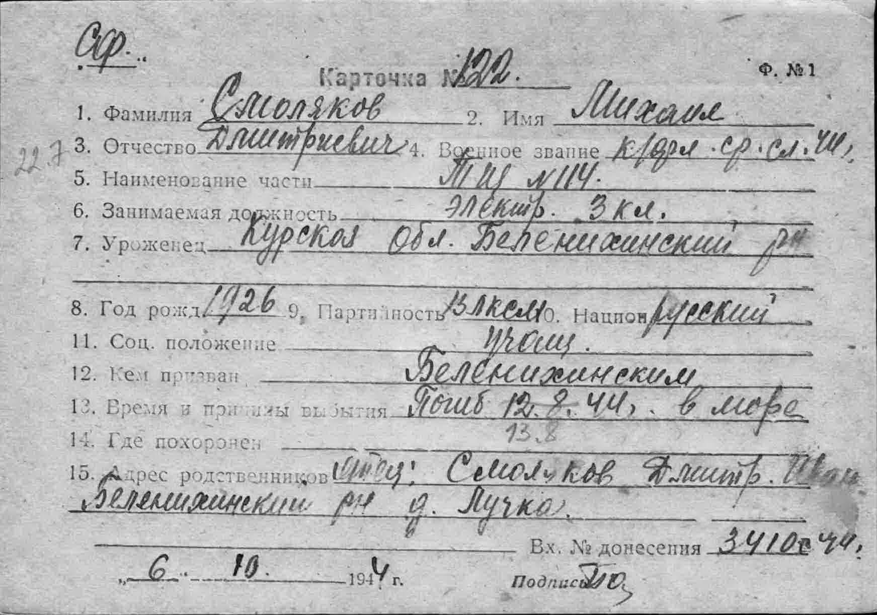 Донесение о безвозвратных потерях 3410 от 03.10.1944 (ЦВМА, Ф. 864, О. 1, Д. 1358).
