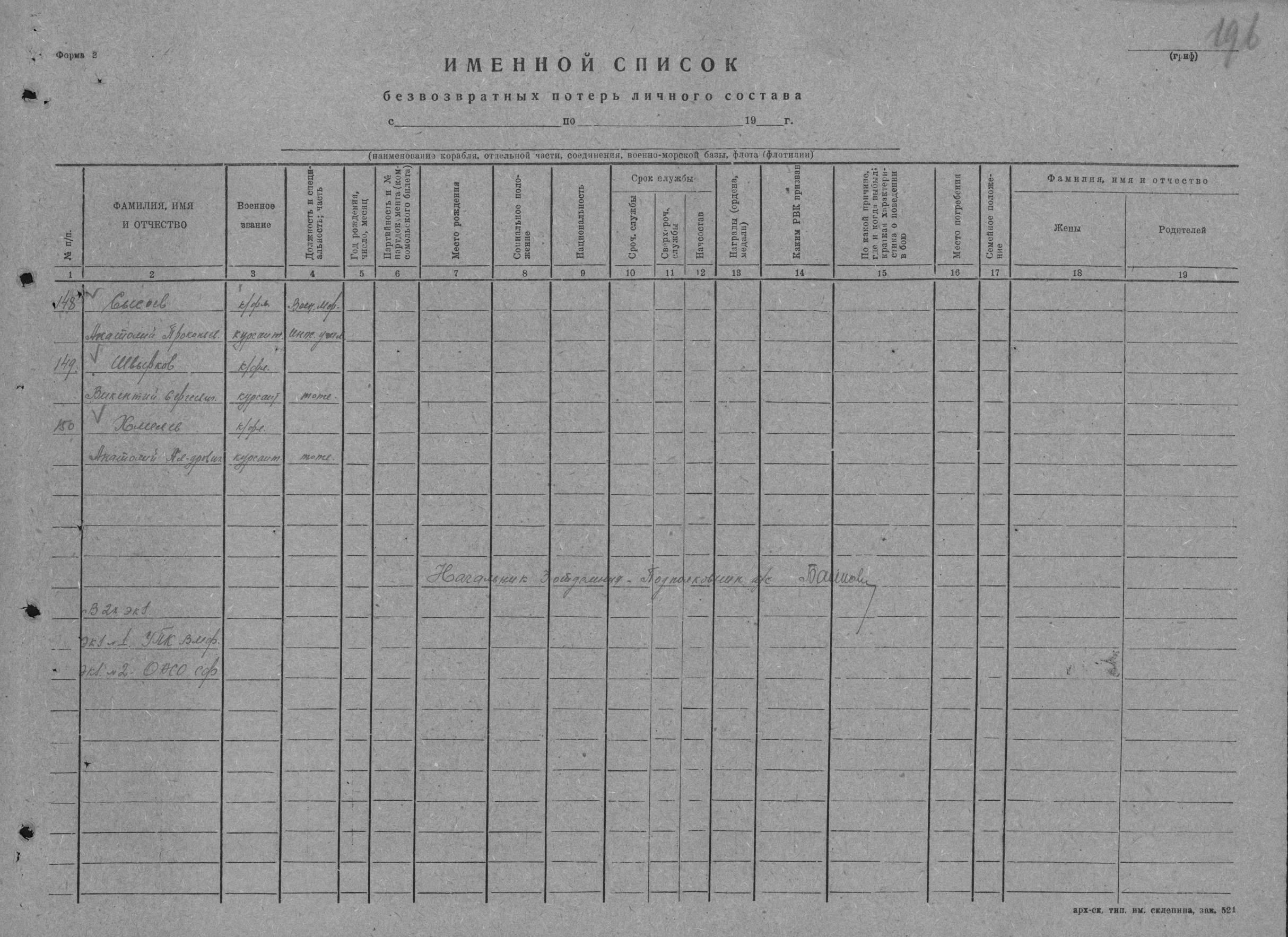 Донесение о безвозвратных потерях 3496 от 19.10.1944 (ЦВМА, Ф. 864, О. 1, Д. 1341).
