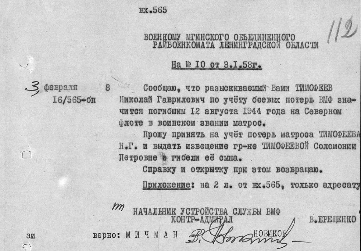 Донесение о безвозвратных потерях 3410 от 03.10.1944 (ЦВМА, Ф. 864, О. 1, Д. 1358).