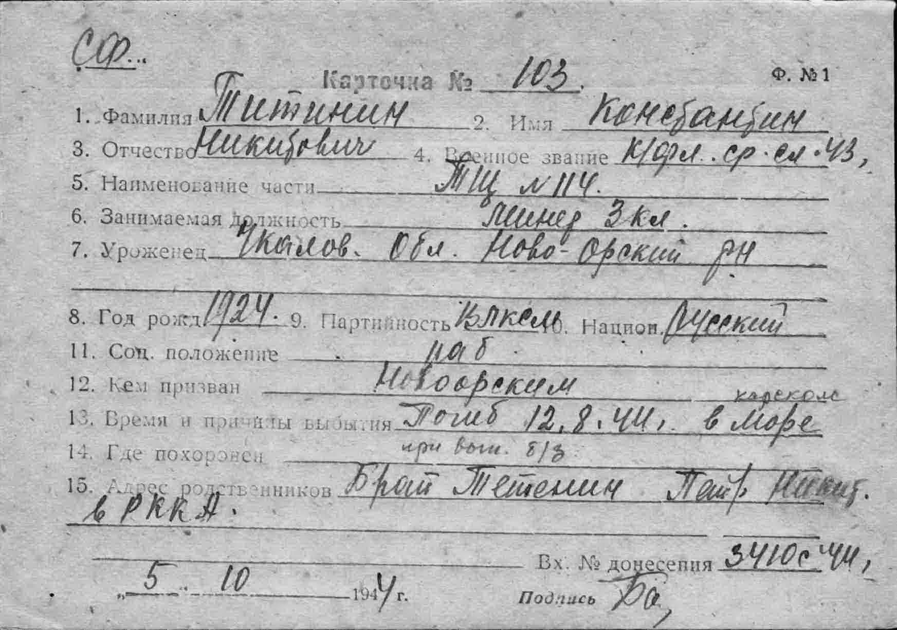 Донесение о безвозвратных потерях 3410 от 03.10.1944 (ЦВМА, Ф. 864, О. 1, Д. 1358).