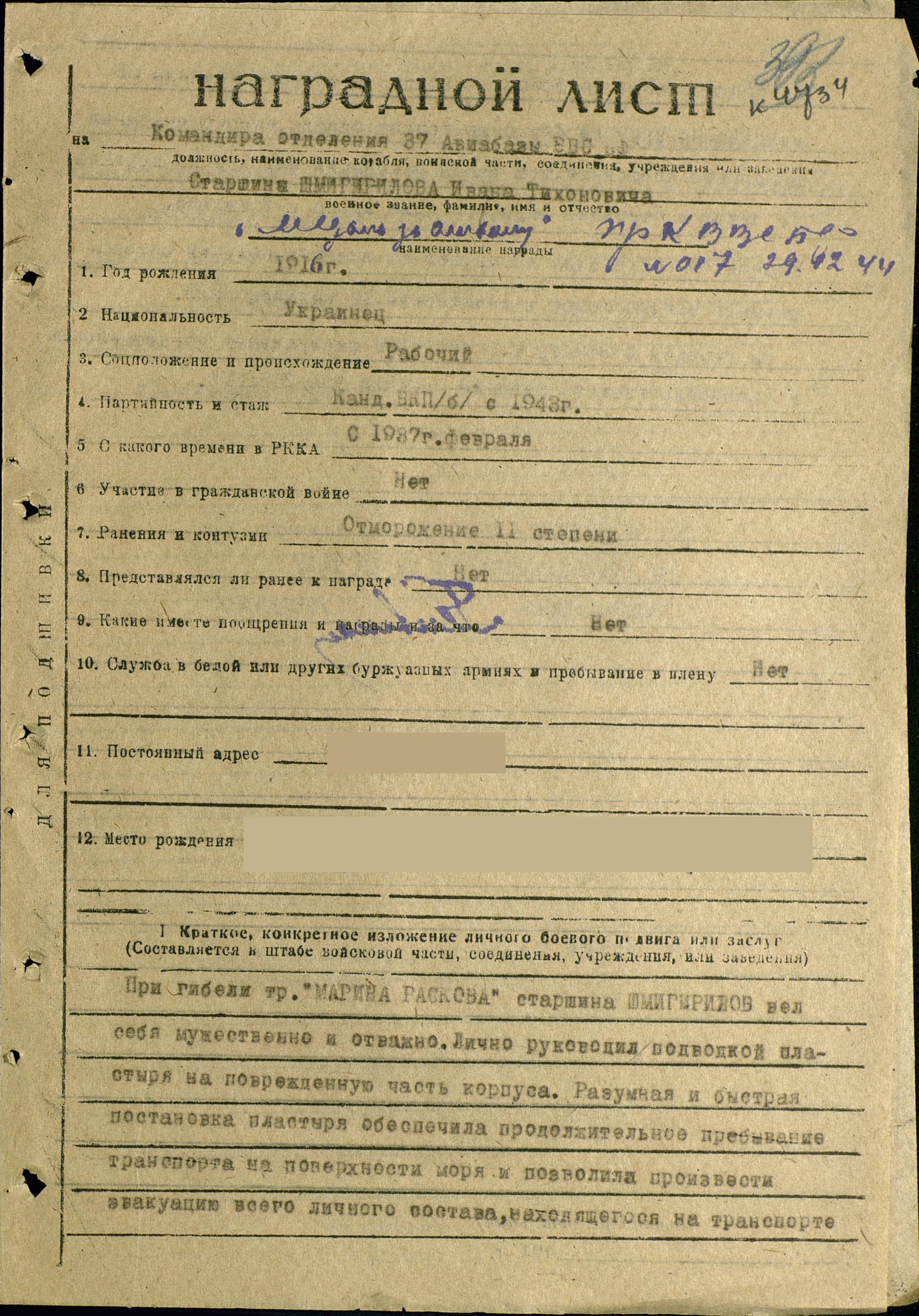 При гибели транспорта «Марина Раскова» старшина Шмигирилов вел себя мужественно и отважно. Лично руководил подводкой пластыря на поврежденную часть корпуса. Разумная и быстрая постановка пластыря обеспечила продолжительное пребывание транспорта на поверхности моря и позволила произвести эвакуацию всего личного состава, находящегося на транспорте, на спасательные средства. Находясь в составе команды [из] 85 человек на кунгасе без пищи, теплой одежды, высоко сохранил [сохранил высокое] моральное состояние, тем самым обеспечил нахождение кунгаса 13 суток в открытом море при силе ветра 7 баллов. Борясь со стихией за жизнь, шел на лишения, получил обморожение ног, но людей в количестве 12 человек спас.