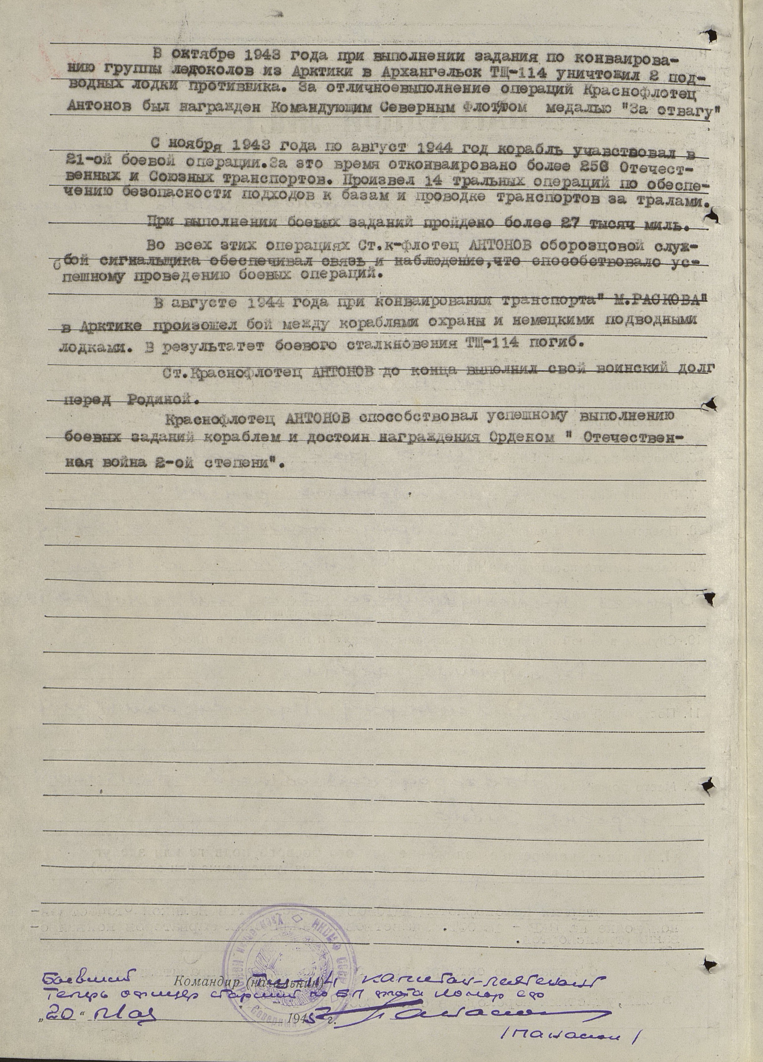 Антонов Павел Васильевич, спасен; воинское звание – краснофлотец (ст. краснофлотец); должность (специальность), часть – сигнальщик, тральщик ТЩ-114 6 ДТЩ Бригада траления ОВР ГБ СФ; год рождения – 1916; место рождения – Ленинградская обл.; партийность – член ВКП(б) с 1942 г.; социальное положение – рабочий; национальность – русский; служба в армии – в РККА с 1938 (1941) г.; награды – медаль «За отвагу», орден Красной Звезды; постоянный адрес –