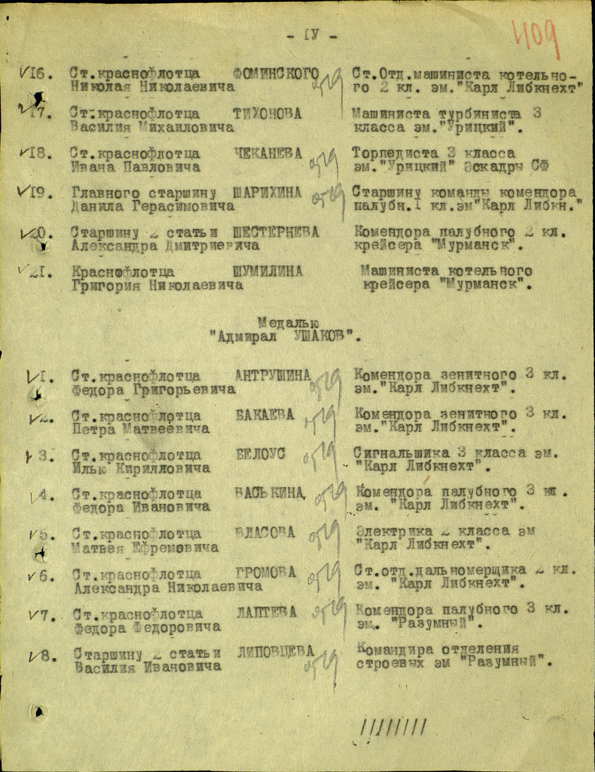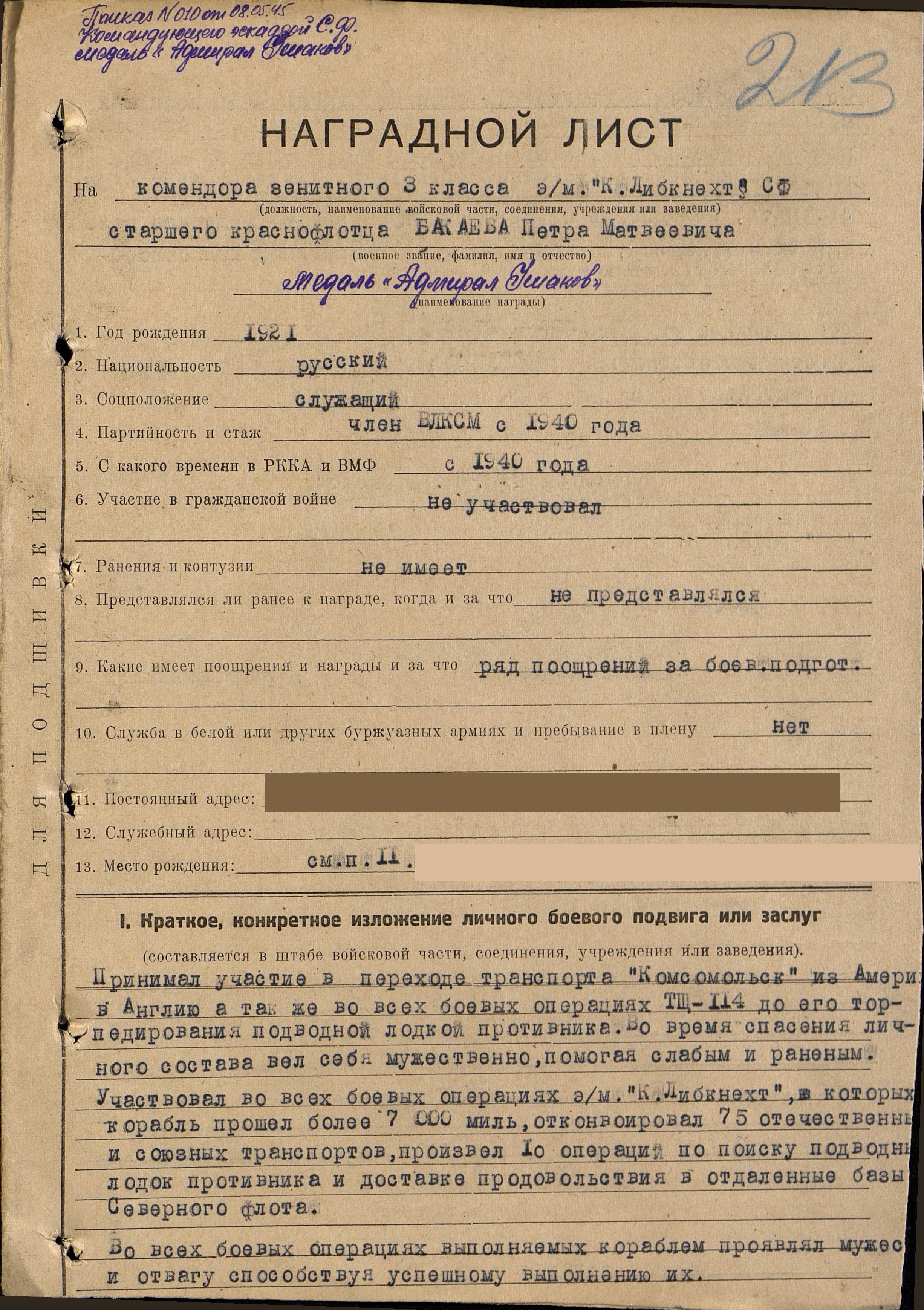 Наградной лист.