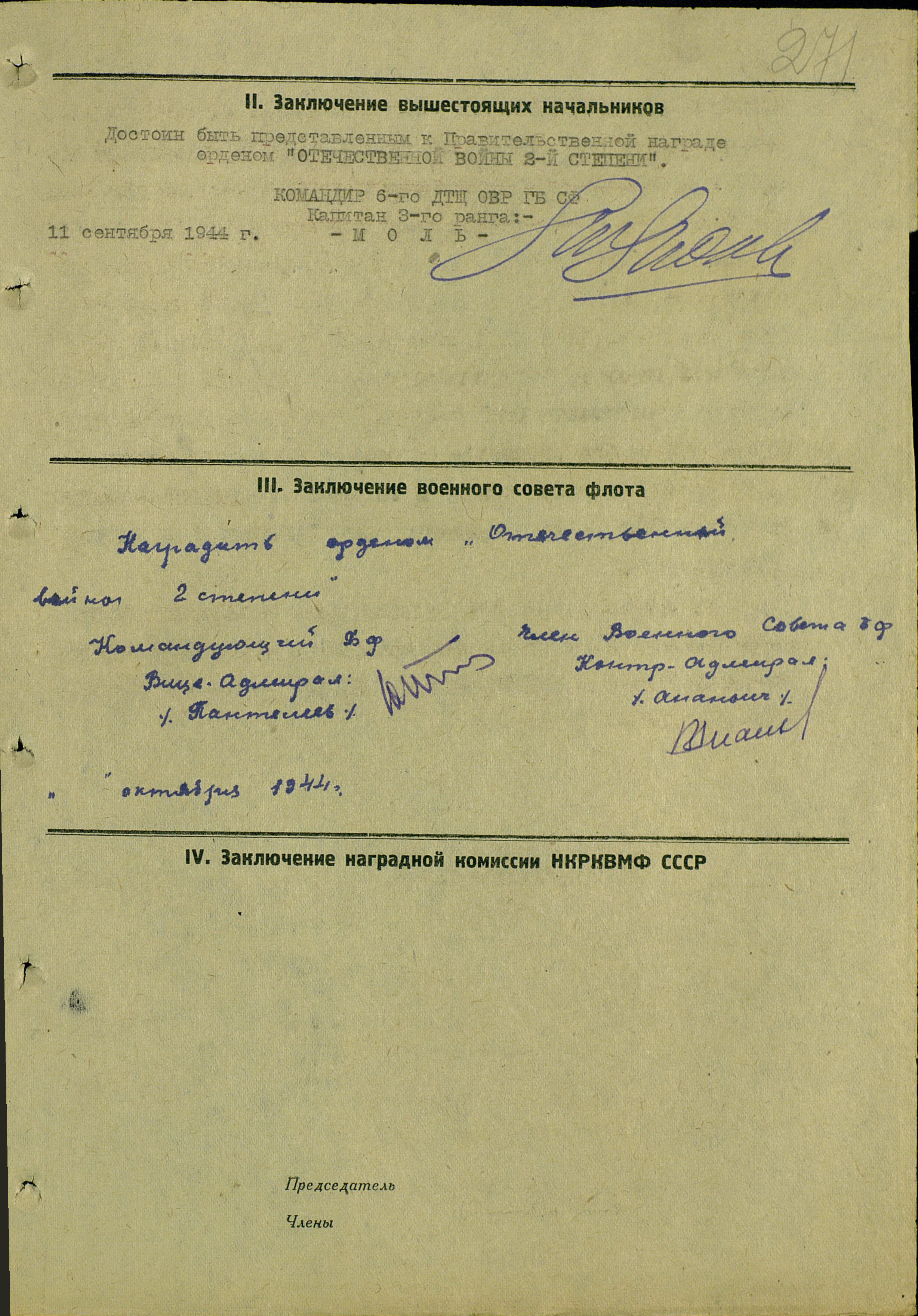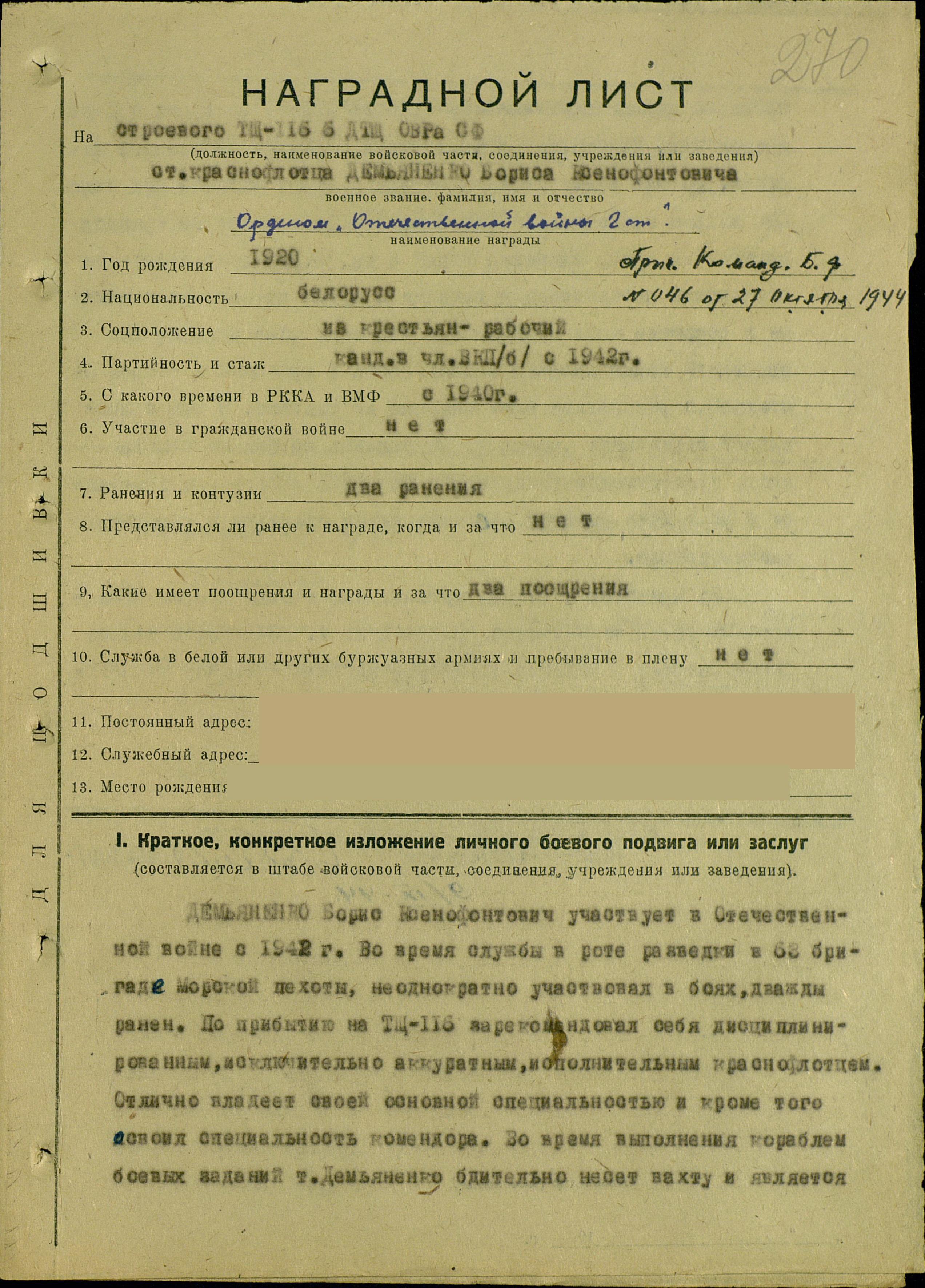 За мужество и отвагу, проявленные в боях против немецко-фашистских захватчиков, представляю тов. Демьяненко Бориса Ксенофонтовича к правительственной награде – ордену Отечественной войны II степени.