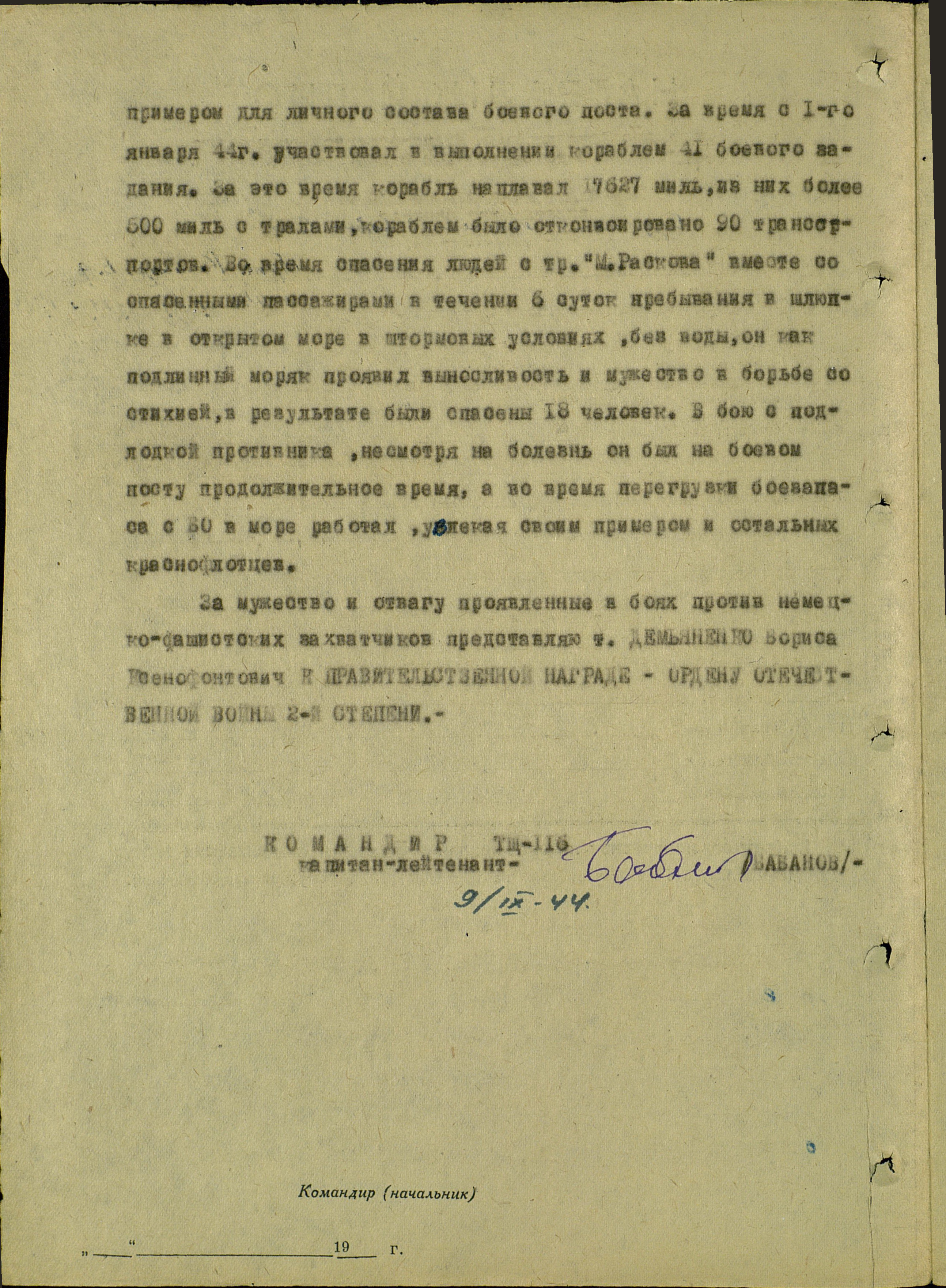 Демьяненко Борис Ксенофонтович участвует в Отечественной войне с 1942 года. Во время службы в роте разведки в 63 бригаде морской пехоты неоднократно участвовал в боях, дважды ранен. По прибытию на ТЩ-116 зарекомендовал себя дисциплинированным, исключительно аккуратным, исполнительным краснофлотцем. Отлично владеет своей основной специальностью, и кроме того, освоил специальность комендора. Во время выполнения кораблем боевых заданий тов. Демьяненко бдительно несет вахту и является примером для личного состава боевого поста. С 1 января 1944 г. участвовал в выполнении кораблем 41 боевого задания. За это время корабль наплавал 17627 миль, из них более 500 миль с тралами, кораблем было отконвоировано 90 транспортов. Во время спасения людей с транспорта «Марина Раскова» вместе со спасенными пассажирами в течение 6 суток пребывания в шлюпке в открытом море, в штормовых условиях, без воды, он как подлинный моряк проявил выносливость и мужество в борьбе со стихией, в результате были спасены 18 человек. В бою с подлодкой противника, несмотря на болезнь, он был на боевом посту продолжительное время, а во время перегрузки боезапаса с БО в море работал, увлекая своим примером и остальных краснофлотцев.