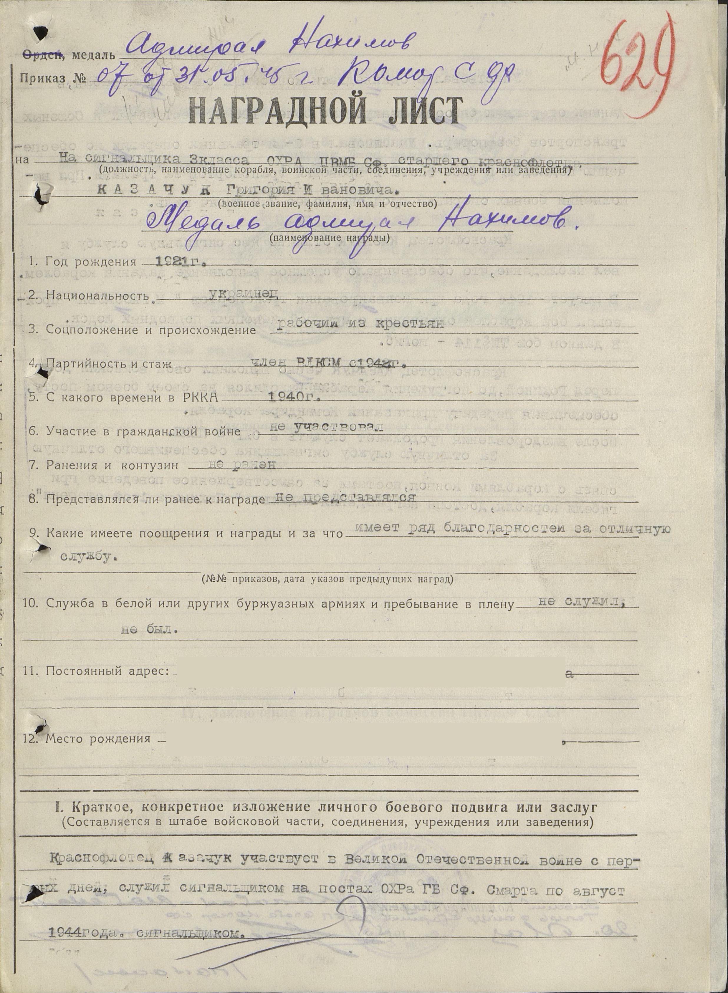 Краснофлотец Казачук участвует в Великой Отечественной войне с первых дней, служил сигнальщиком на постах ОХР ГБ СФ с марта по август 1944 года.