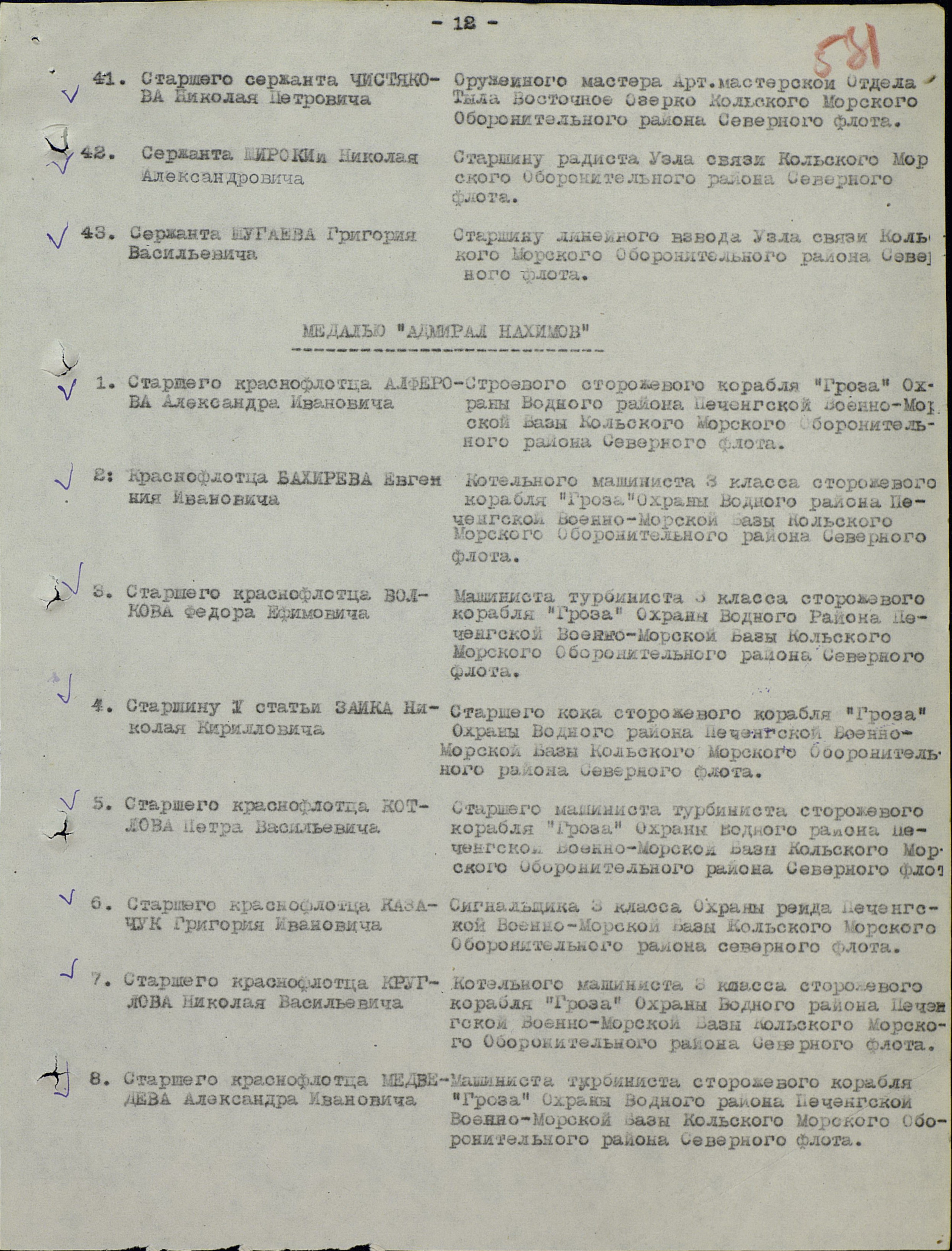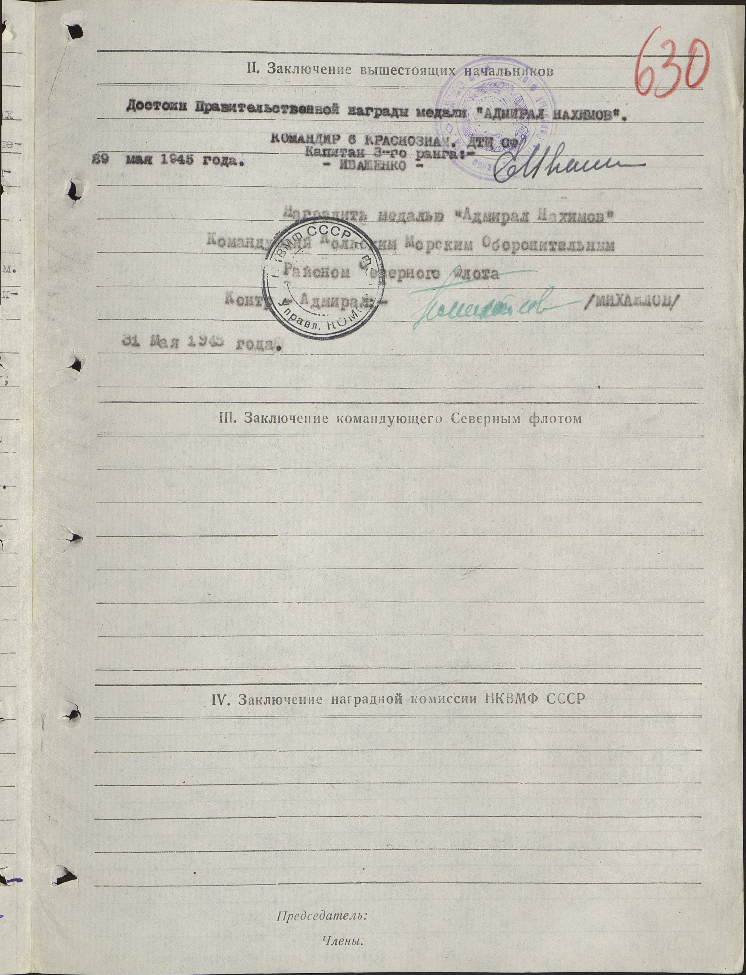 За отличную службу сигнальщика, обеспечившего отличную связь с кораблями конвоя, постами, за самоотверженное поведение при гибели корабля достоин награждения медалью Нахимова.