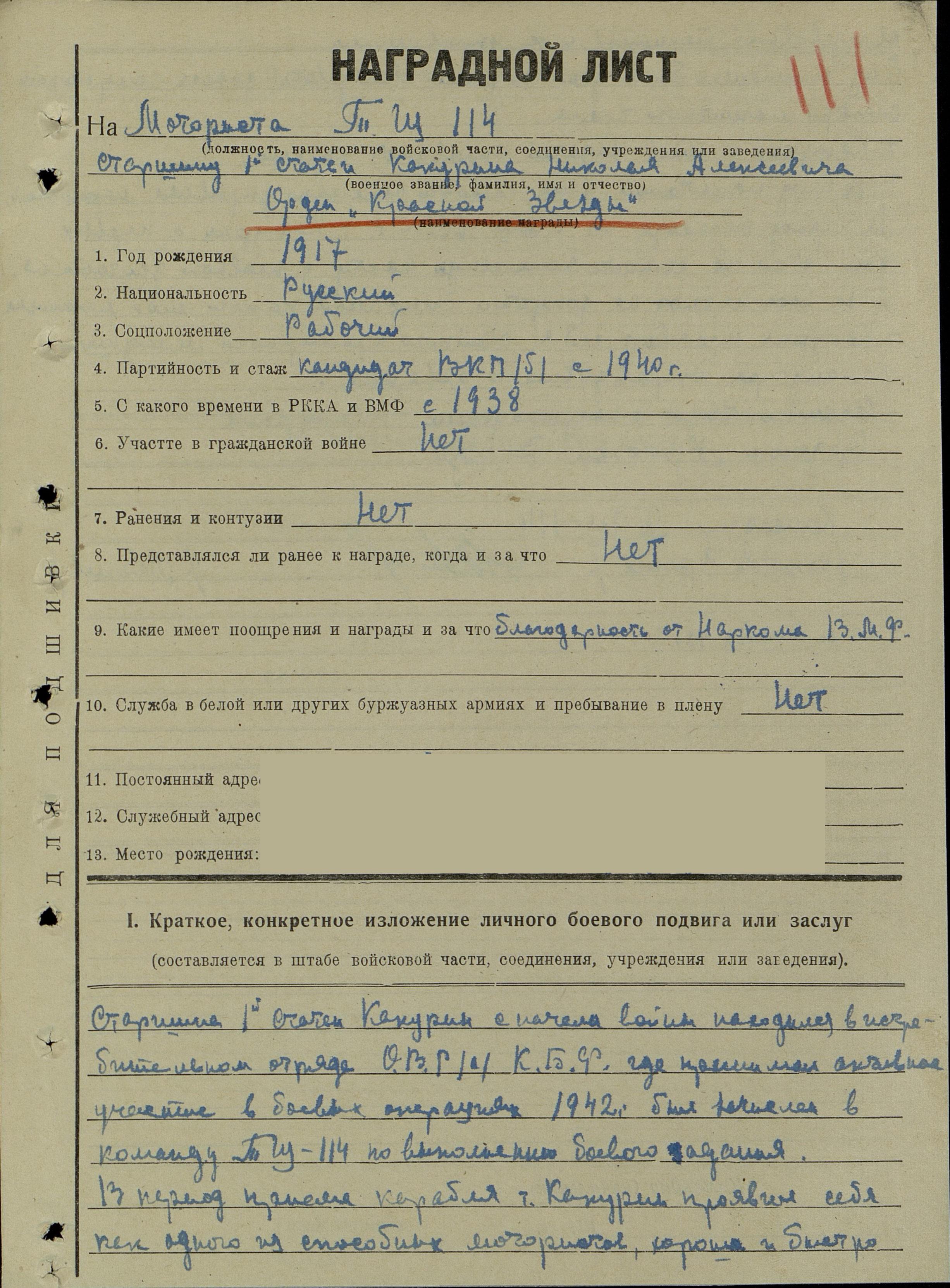 Старшина 1 статьи Какурин с начала войны находился в истребительном отряде ОВР КБФ, где принимал активное участие в боевых операциях 1942 г., был зачислен в команду ТЩ-114 по выполнению боевого задания (?).