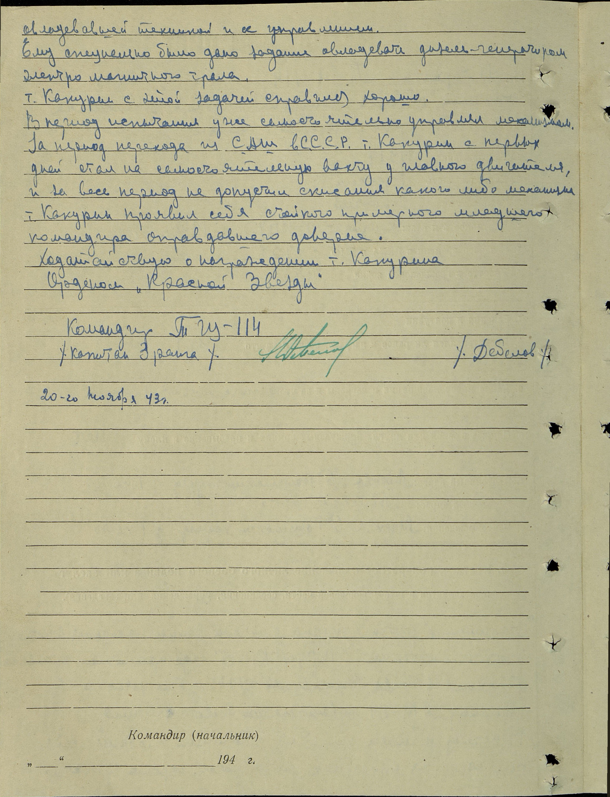 В период испытания уже самостоятельно управлял механизмом. За период перехода из США в СССР т. Какурин с первых дней стал на самостоятельную вахту у главного двигателя и на весь период не допустил скисания (?) какого-либо механизма. Т. Какурин проявил себя [как] стойкий примерный младший командир, оправдавший доверие.