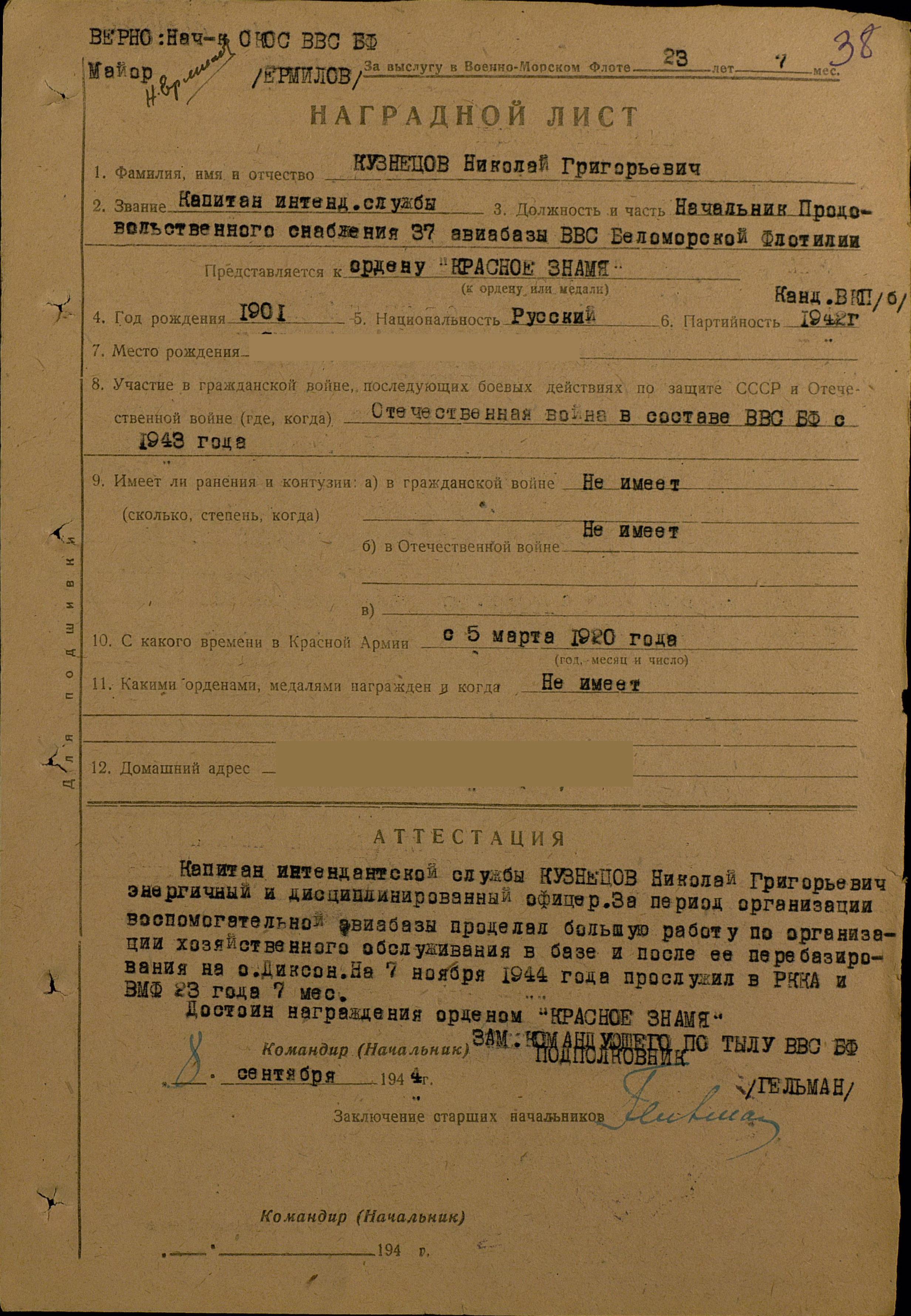 Капитан интендантской службы Кузнецов Николай Григорьевич энергичный и дисциплинированный офицер. За период организации вспомогательной авиабазы проделал большую работу по организации хозяйственного обслуживания в базе и после ее перебазирования на о. Диксон. На 7 ноября 1944 г. прослужил в РККА и ВМФ 23 года 7 месяцев.