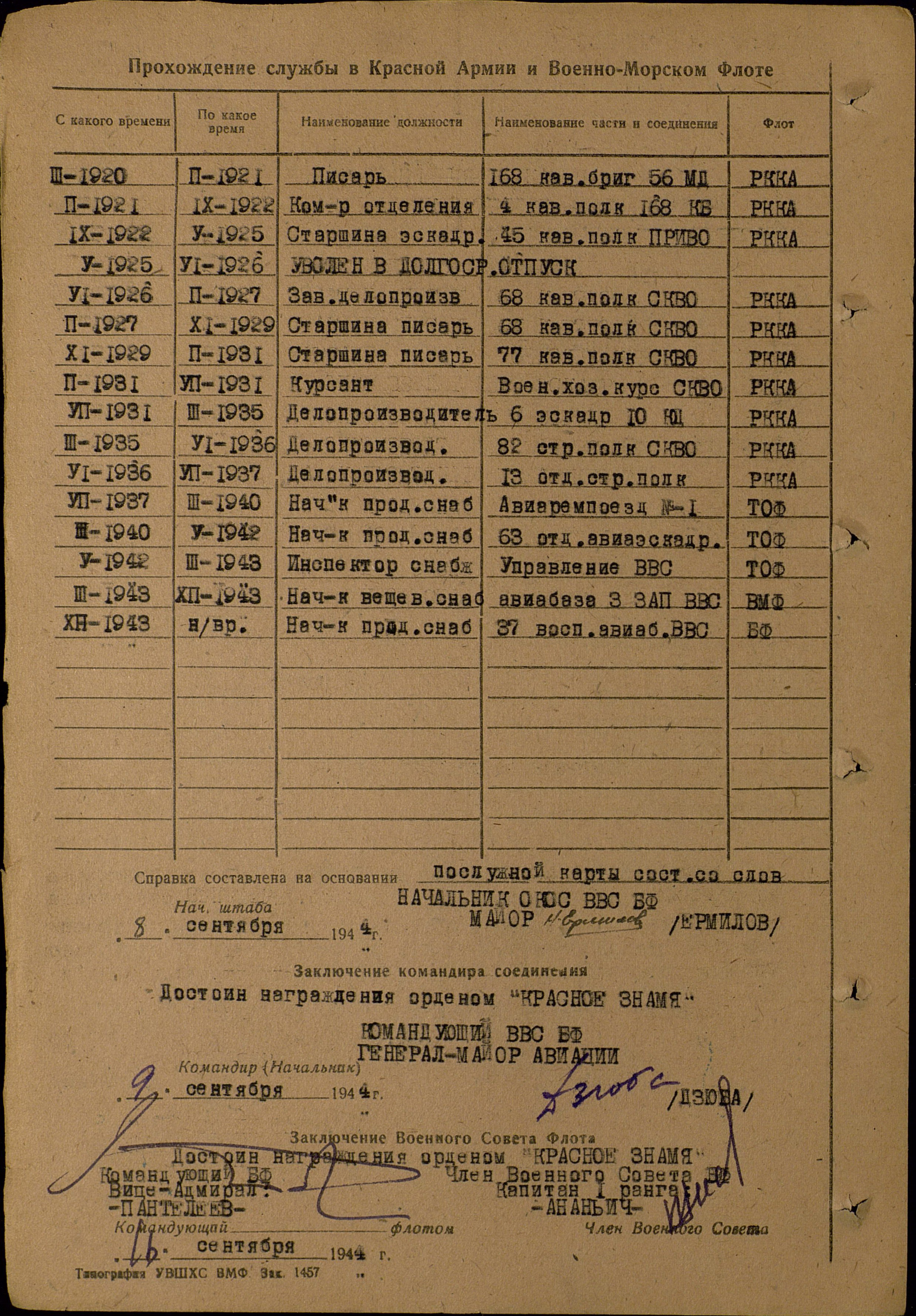 За время своего пребывания и прохождения военной службы на 37 вспомогательной авиабазе в должности начальника продснабжения с марта 1944 г. показал свои личные качества, как знающего свое дело. Своей четкостью и организованностью, требовательностью к себе и своим подчиненным, сумел поставить свою работу так. В результате чего обеспечил всем не обходимым для питания личного состава базы и 44 авиаполка для нового места базирования.