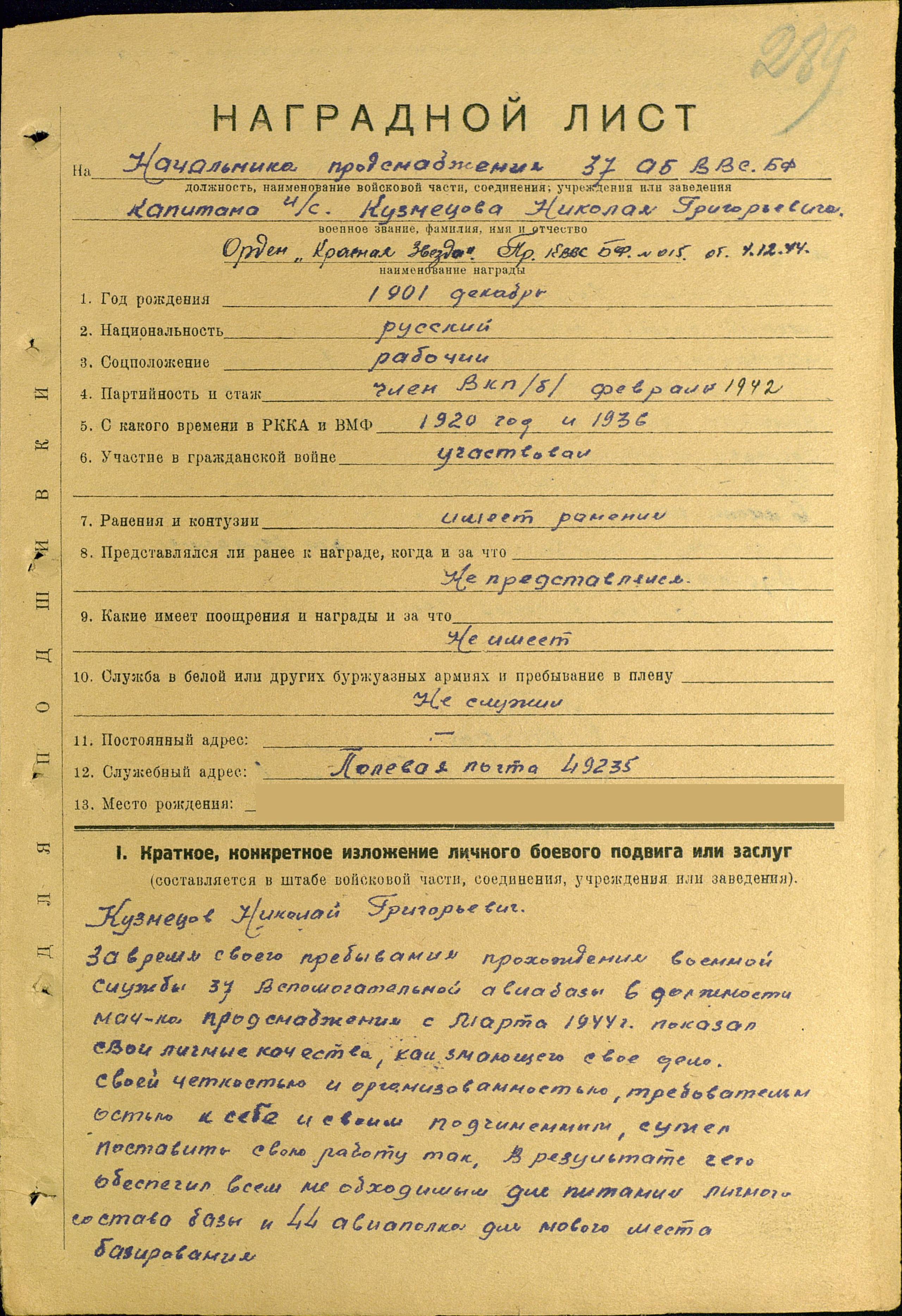 318. Кузнецов Николай Григорьевич, спасен, пассажир транспорта «Марина Раскова»; воинское звание – капитан интендантской службы; должность (специальность), часть – начальник продовольственного снабжения 37 вспомогательной авиабазы ВВС БВФ; дата рождения – 12.1901; партийность – член ВКП(б) с 02.1942 г. (кандидат в члены ВКП(б) с 1942 г.); социальное положение – рабочий; национальность – русский; служба в армии – в РККА с 05.03.1920 г.; награды – орден Красного Знамени, орден Красной Звезды; служебный адрес – п/п 49235; дополнительная информация – с 03.1920 г. по 02.1921 г. писарь 168 кав. бриг. 56 МД, 02.1921–09.1922 гг.: командир отделения 4 кав. полк 168 КБ, 09.1922–05.1925 гг.: старшина эскадрильи 45 кав. полк ПРИВО, 06.1926–02.1927 гг.: заведующий делопроизводством 68 кав. полка СКВО, 02.1927–11.1929 гг.: старшина писарь 68 кав. полка СКВО, 11.1929–02.1931 гг.: старшина писарь 77 кав. полка СКВО, 03.1935–06.1936 гг.: делопроизводитель 82 СП СКВО, 06.1936–07.1937 гг.: делопроизводитель 13 отдельного СП, 07.1937–03.1940 гг.: начальник продовольственного снабжения авиаремпоезда № 1, ТОФ, 03.1940–05.1942 гг.: начальник продовольственного снабжения 63 отдельной авиаэскадрильи, ТОФ, 05.1942–03.1943 гг.: инспектор снабжения Управления ВВС ТОФ, с 12.1943 г. начальник продовольственного снабжения 37 вспомогательной базы ВВС БВФ, во время гибели транспорта «Марина Раскова» тов. Кузнецов принимал меры по организации и спасению личного состава. Во время шторма с группой краснофлотцев направился на ТЩ-114 и при гибели ТЩ-114 был вынужден остаться с группой краснофлотцев в открытом море, и пробыл без питания и воды около 6 суток, были спасены с ним 5 человек. Тов. Кузнецов, шедший на выполнение боевого задания вместе с женой (Кузнецова Валентина Михайловна – его жена?) и дочерью, остался один в живых.