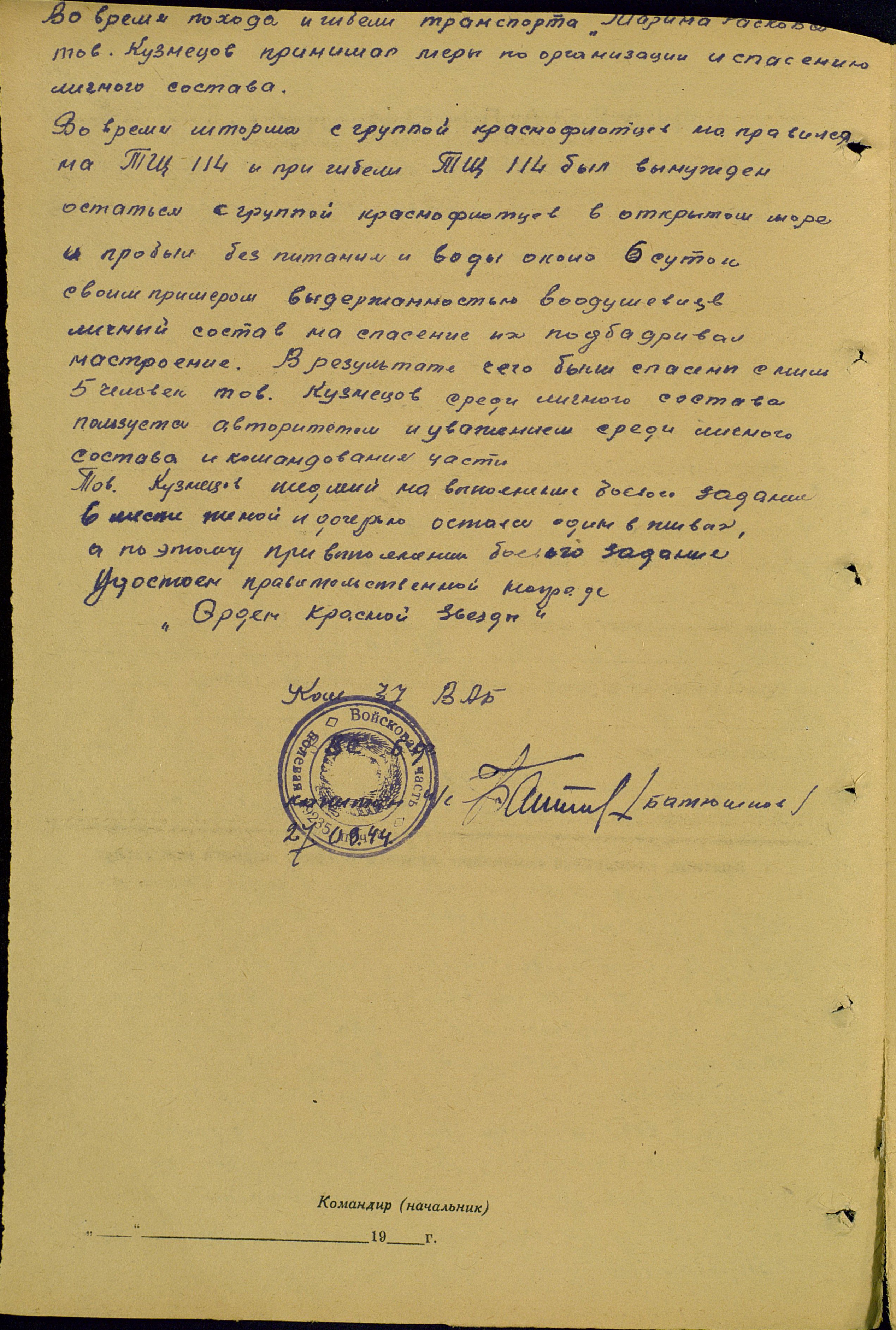 Во время похода и гибели транспорта «Марина Раскова» тов. Кузнецов принимал меры по организации и спасению личного состава.
