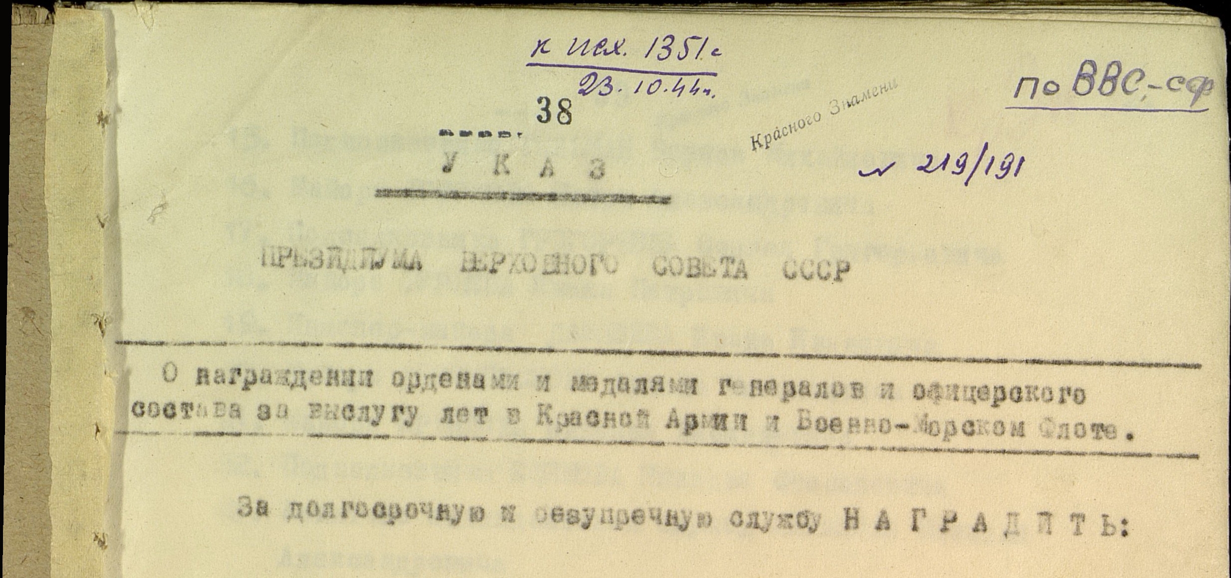 За время своего пребывания и прохождения военной службы на 37 вспомогательной авиабазе в должности начальника продснабжения с марта 1944 г. показал свои личные качества, как знающего свое дело. Своей четкостью и организованностью, требовательностью к себе и своим подчиненным, сумел поставить свою работу так. В результате чего обеспечил всем не обходимым для питания личного состава базы и 44 авиаполка для нового места базирования.