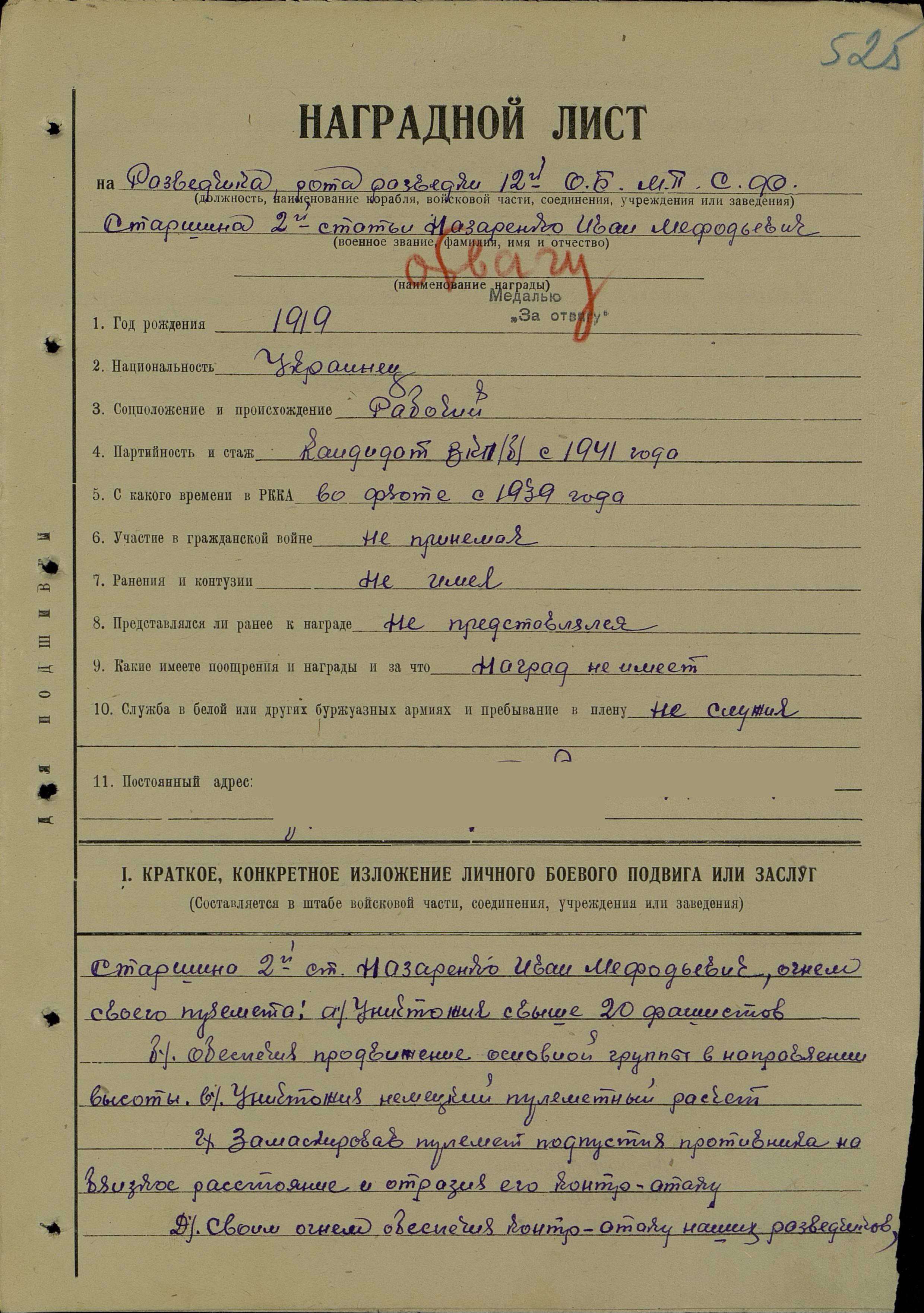 Назаренко Иван Мефодьевич, спасен; воинское звание – старшина 2 статьи; должность (специальность), часть – командир отделения автоматчиков, тральщик ТЩ-116 6 ДТЩ Бригада траления ОВР ГБ СФ (разведчик, рота разведки 12 ОБМП СФ); год рождения – 1919; место рождения – Украинская ССР, Винницкая обл., Немировский р-н, д. Березовка; партийность – член ВКП(б) с 1942 г. (кандидат в члены ВКП(б) с 1941 г.); социальное положение – рабочий; национальность – украинец; служба в армии – в РККА с 1939 г.; награды –