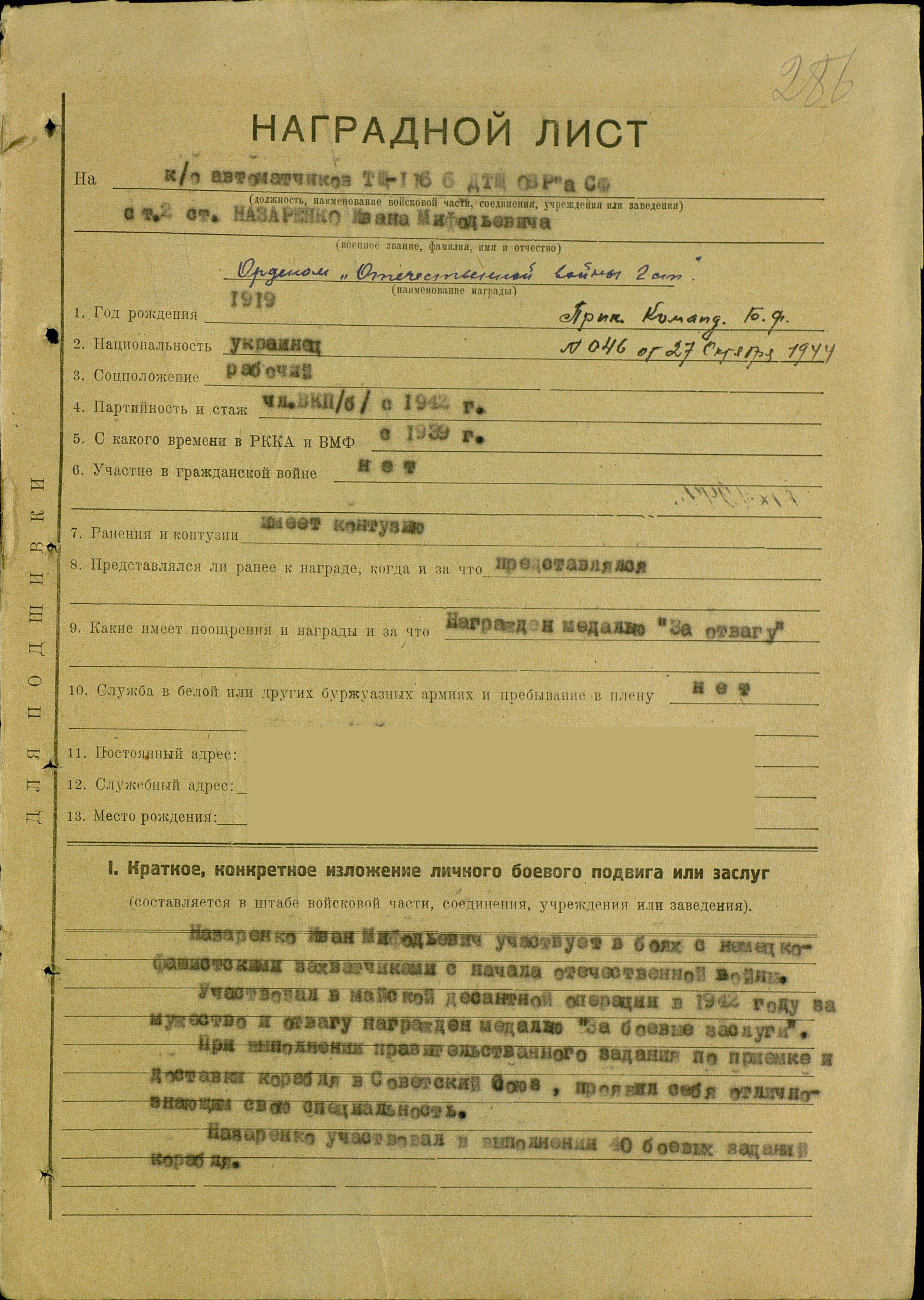 Назаренко Иван Мефодьевич, спасен; воинское звание – старшина 2 статьи; должность (специальность), часть – командир отделения автоматчиков, тральщик ТЩ-116 6 ДТЩ Бригада траления ОВР ГБ СФ (разведчик, рота разведки 12 ОБМП СФ); год рождения – 1919; место рождения – Украинская ССР, Винницкая обл., Немировский р-н, д. Березовка; партийность – член ВКП(б) с 1942 г. (кандидат в члены ВКП(б) с 1941 г.); социальное положение – рабочий; национальность – украинец; служба в армии – в РККА с 1939 г.; награды –
