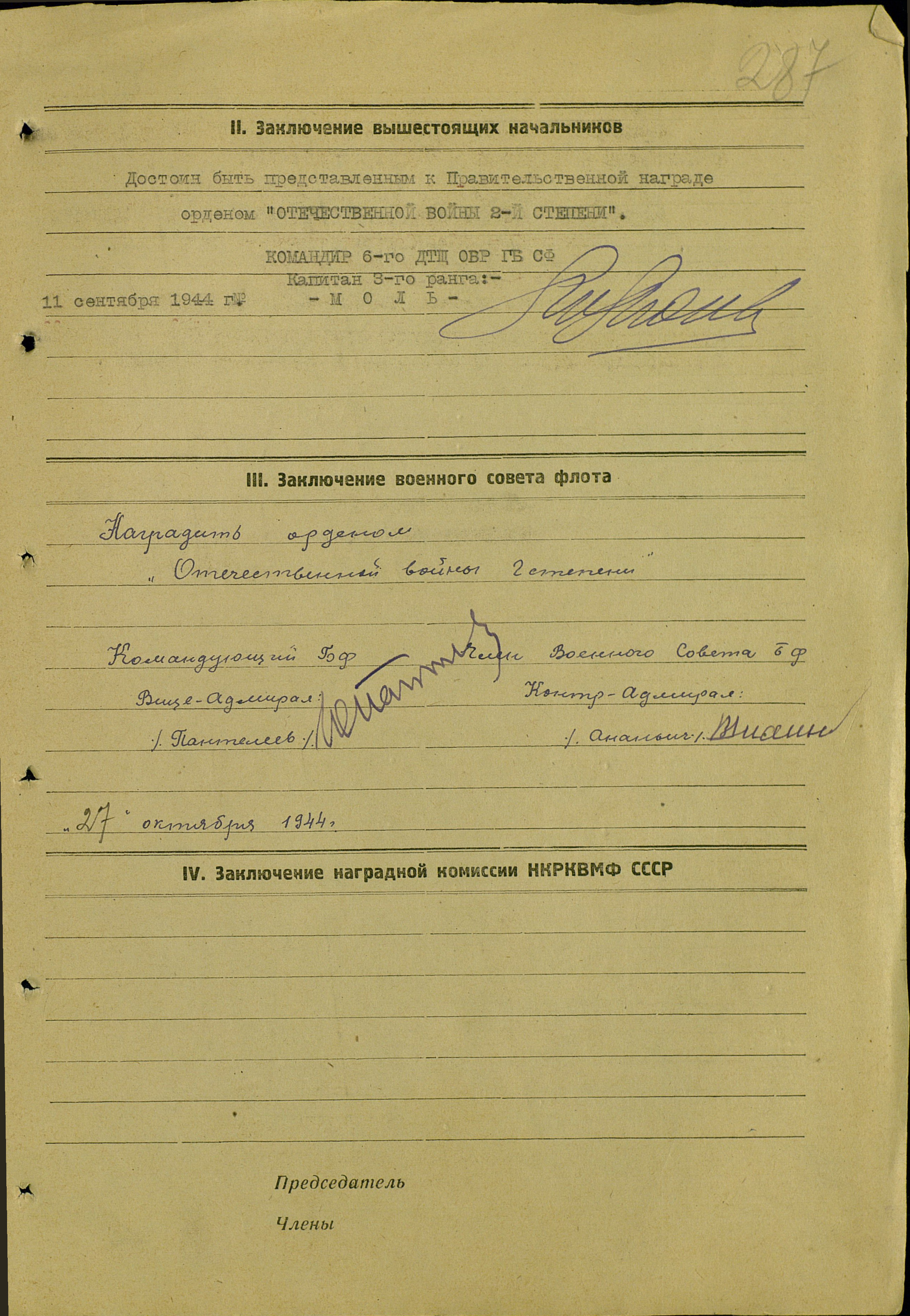 При выполнении правительственного задания по приемке и доставке корабля в Советский Союз проявил себя отлично знающим свою специальность [бойцом].