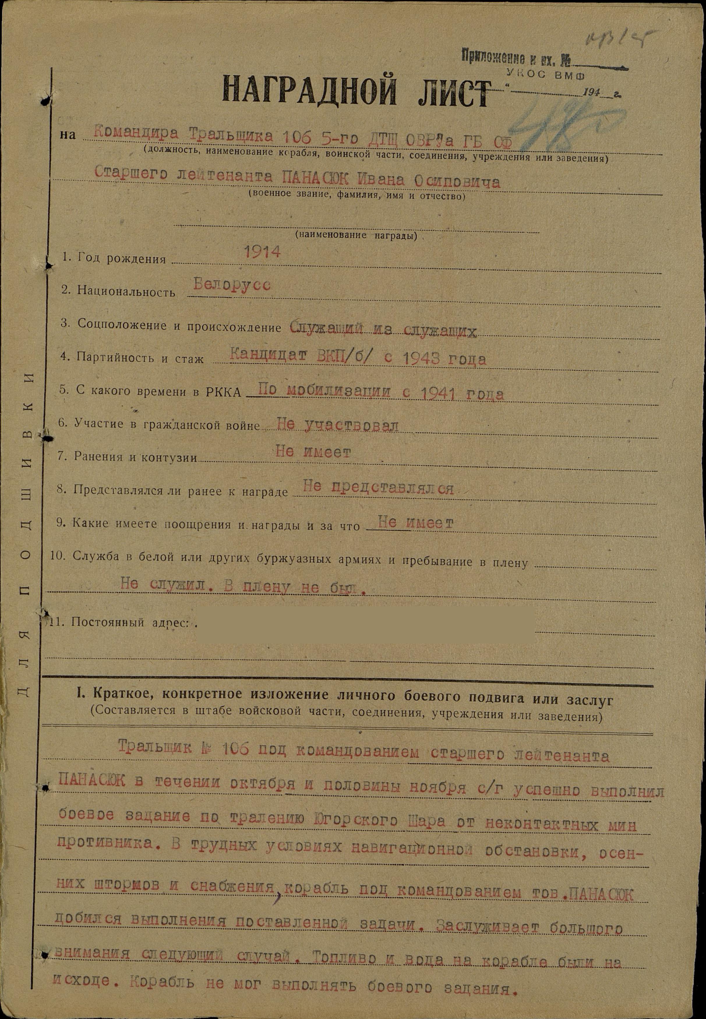 12 августа 1944 года при выполнении боевой операции по конвоированию транспортов (транспорта – С.Ш.) из Архангельска до о. Диксон корабль был торпедирован подлодкой противника и быстро затонул. Тов. Панасюк был тяжело ранен и, несмотря на это, на своем катере вместе с краснофлотцами спасал личный состав. Благодаря усилию тов. Панасюка 25 человек личного состава было спасено и в течение трех суток в Карском море при 5-6 баллах шторма держались на катере.