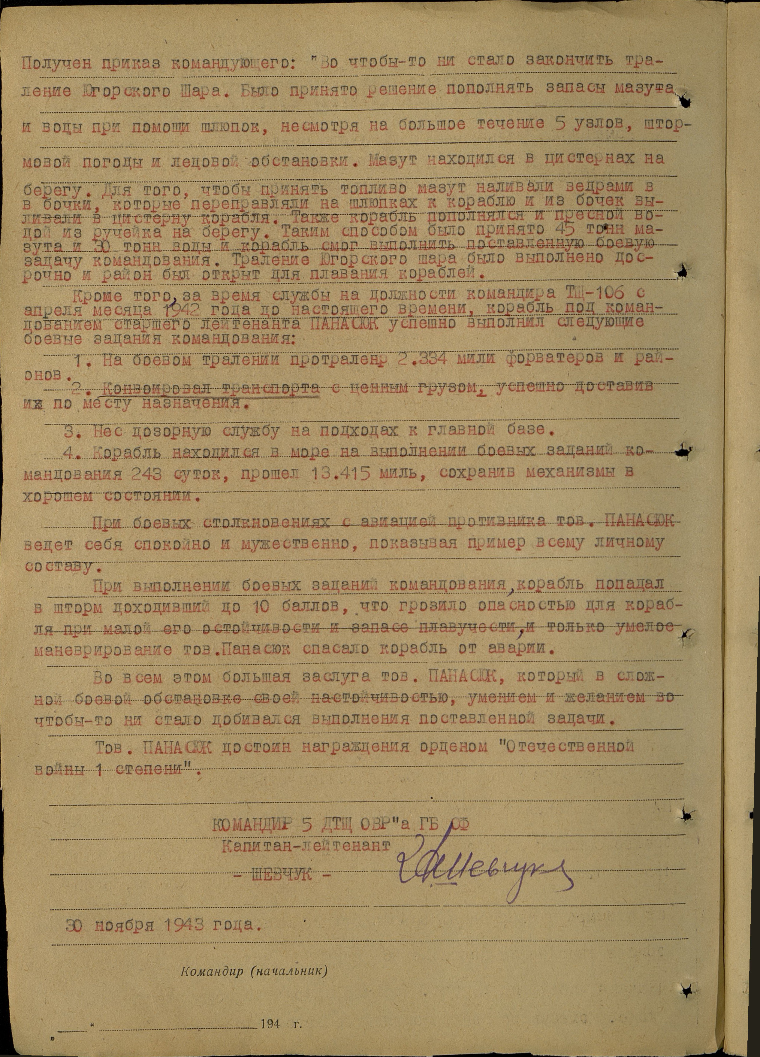 Тральщик № 106 под командованием старшего лейтенанта Панасюка в течение октября и половины ноября с/г успешно выполнил боевое задание по тралению Югорского Шара от неконтактных мин противника. В трудных условиях навигационной обстановки, осенних штормов и снабжения, корабль под командованием тов. Панасюка добился выполнения поставленной задачи. Заслуживает большого внимания следующий случай. Топливо и вода на корабле были на исходе. Корабль не мог выполнять боевое задание. Получен приказ командующего: «Во чтобы-то ни стало закончить траление Югорского Шара». Было принято решение пополнять запасы мазута и воды при помощи шлюпок, несмотря на большое течение – 5 узлов, – штормовую погоду и ледовую обстановку. Мазут находился в цистернах на берегу. Для того чтобы принять топливо, мазут наливали ведрами в бочки, которые переправляли на шлюпках к кораблю и из бочек выливали в цистерну корабля. Также корабль пополнялся и пресной водой из ручейка на берегу. Таким способом было принято 45 тонн мазута и 30 тонн воды и корабль смог выполнить поставленную боевую задачу командования. Траление Югорского шара было выполнено досрочно, и район был открыт для плавания кораблей.