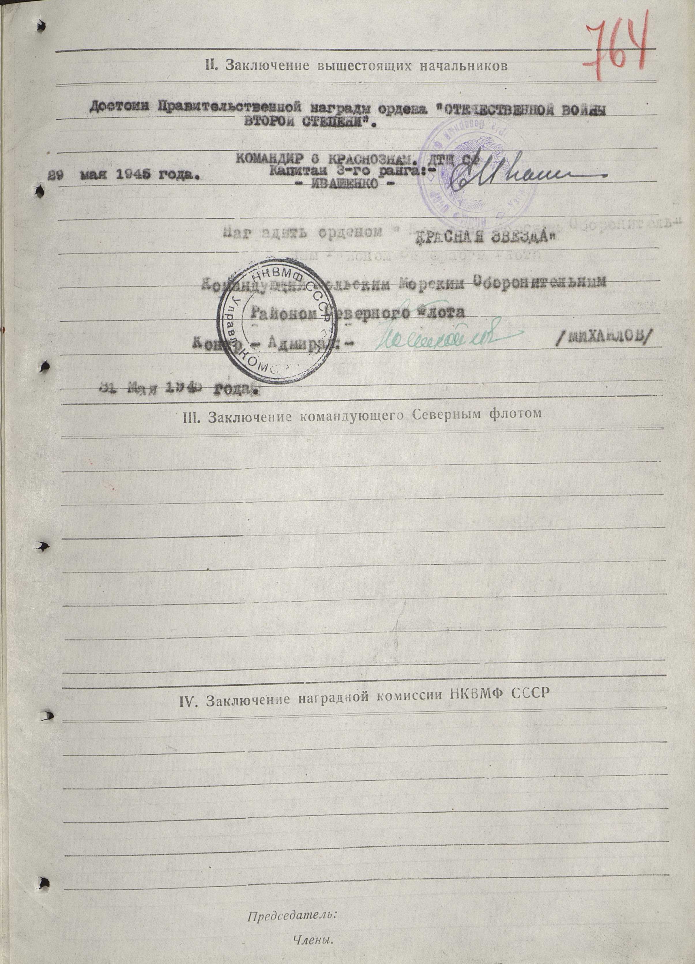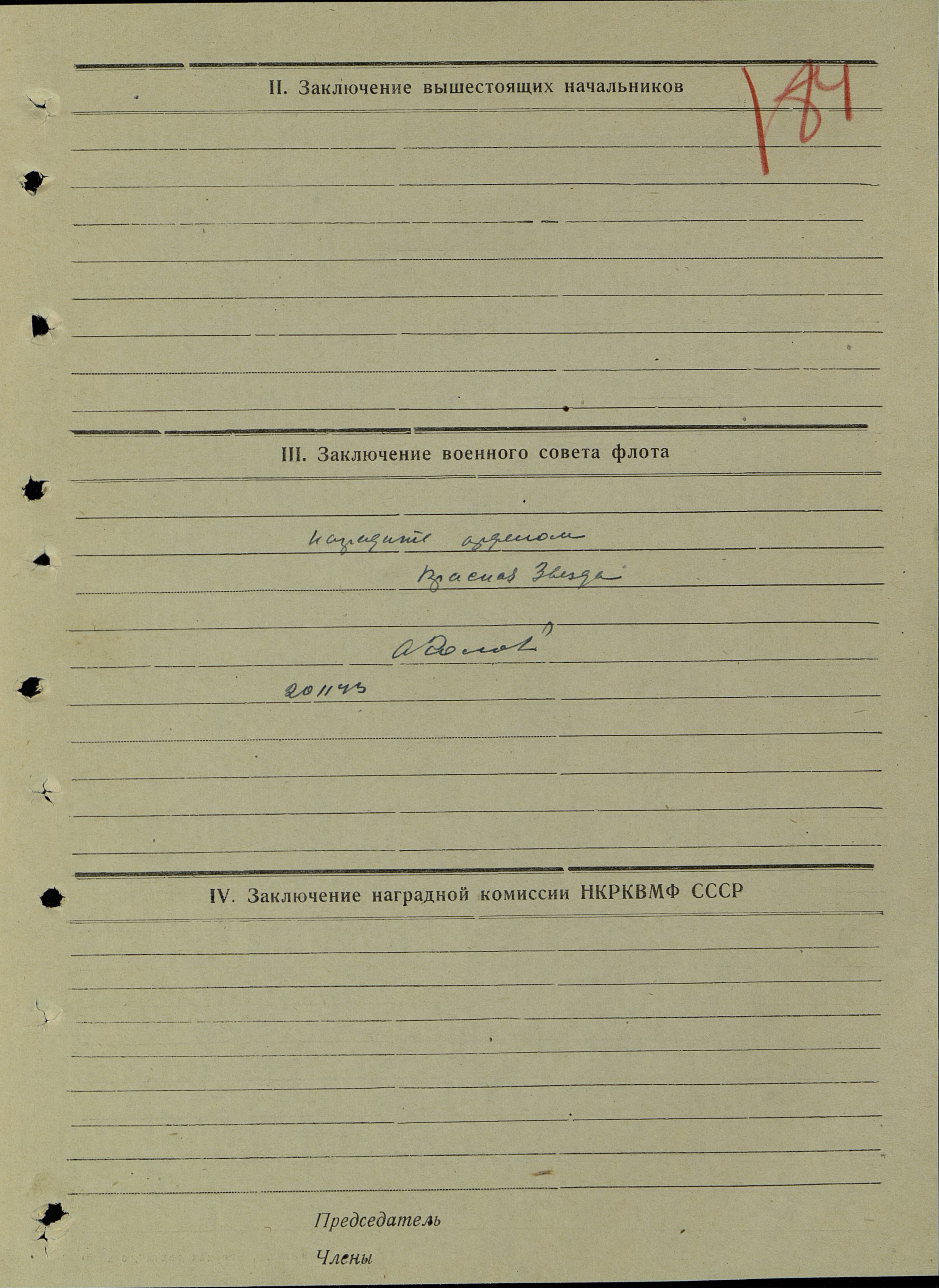 За самоотверженную службу, способствовавшую успешному выполнению боевых заданий командования, старший краснофлотец Соколов достоин награждения орденом Отечественной войны II степени.