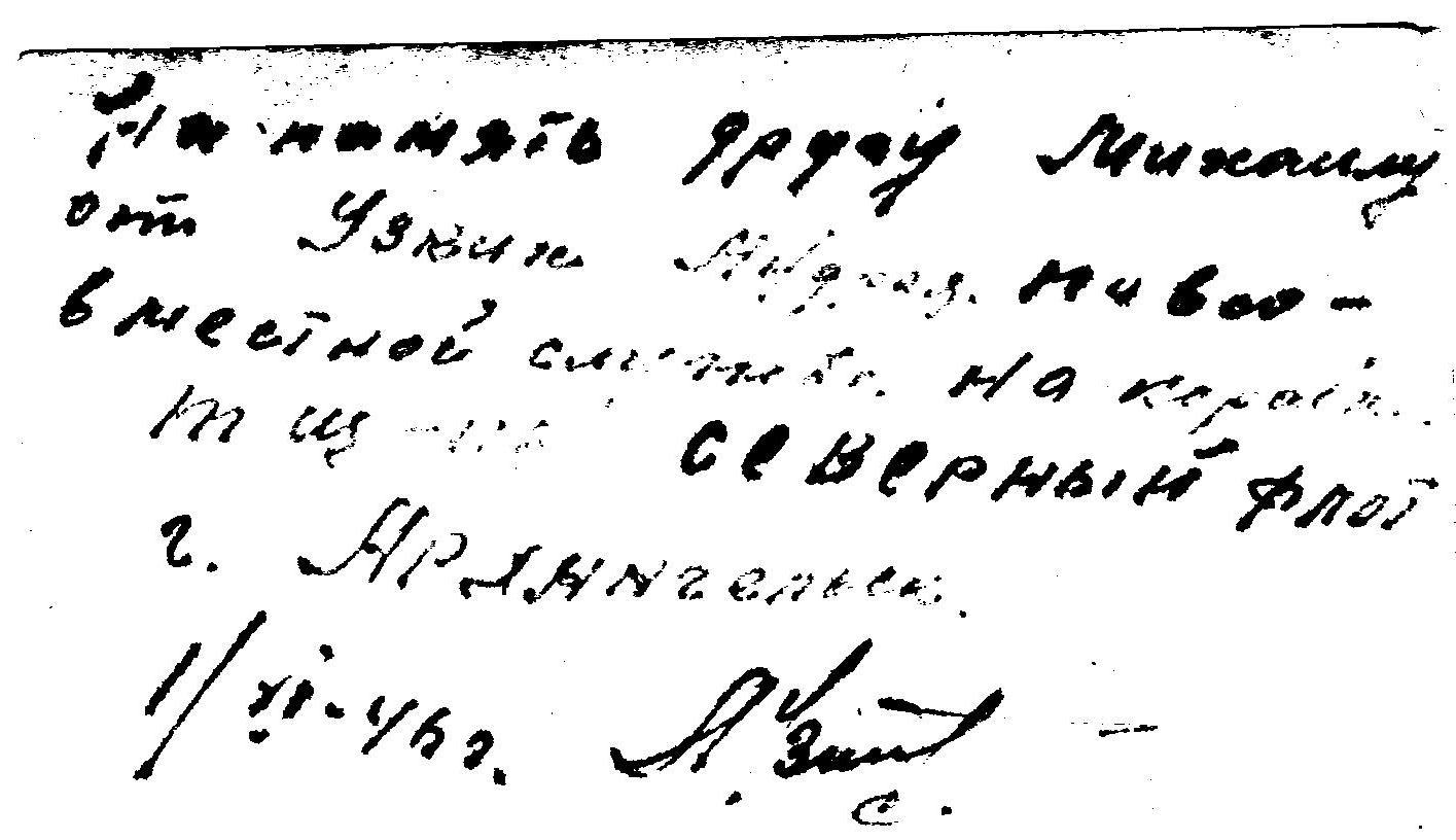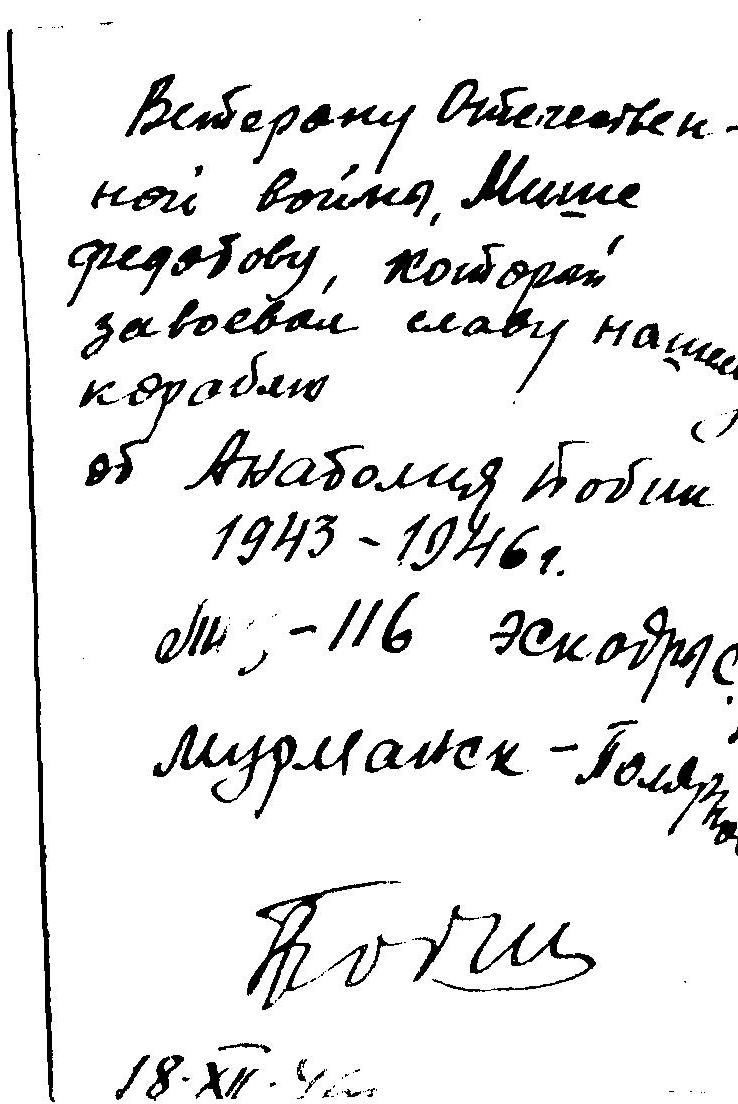 На память другу Михаилу от У…кин (Узкин?) Андрея … совместной службе на корабле ТЩ-116 Северный флот.
