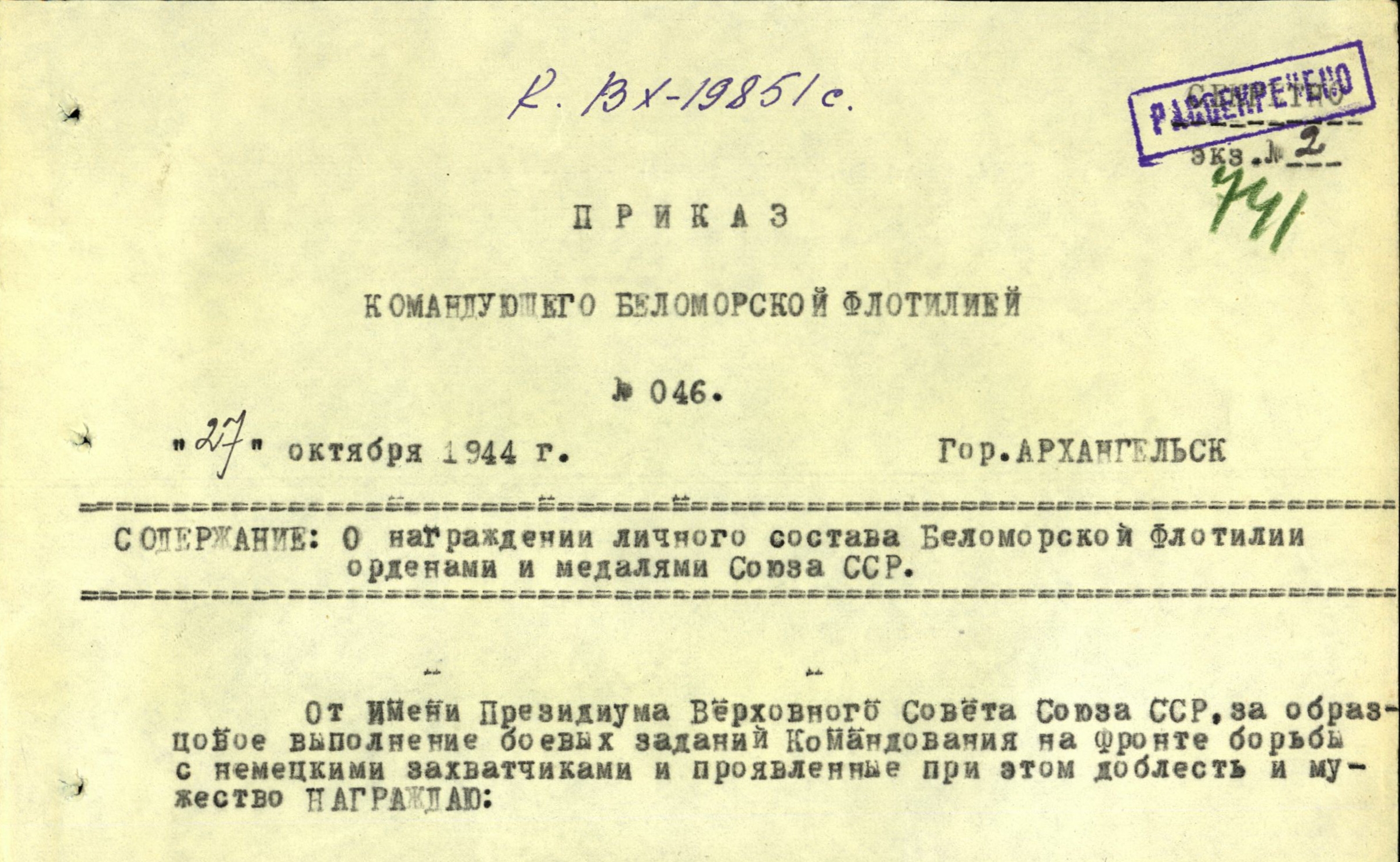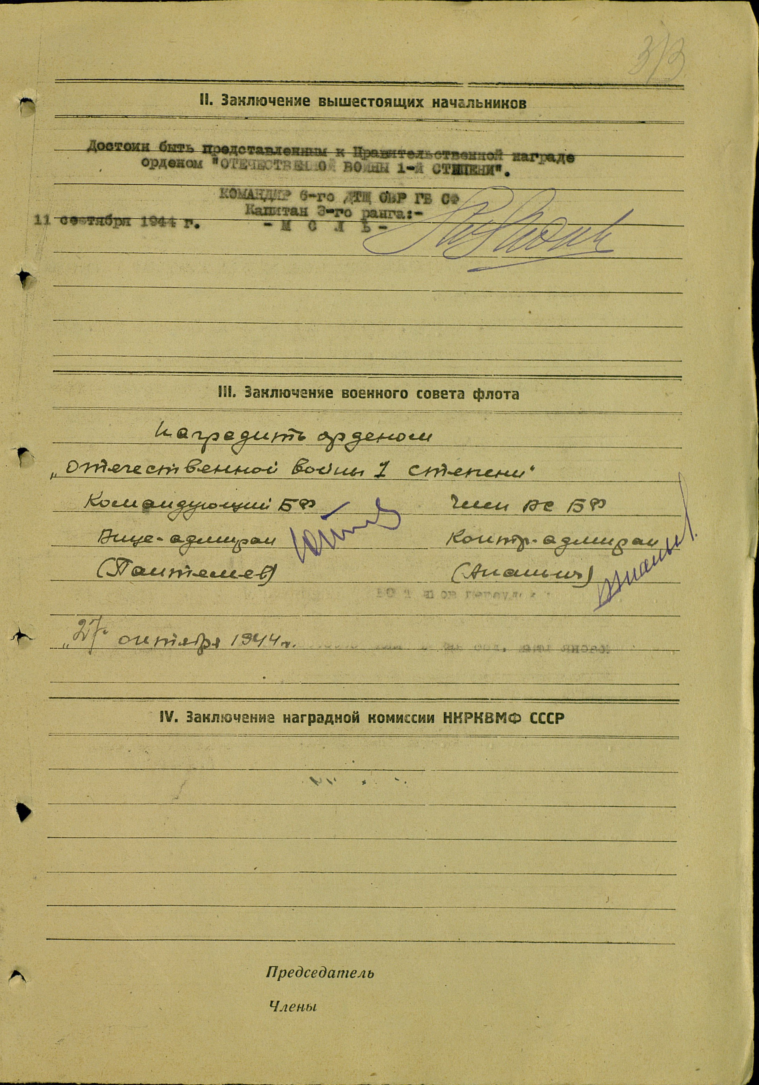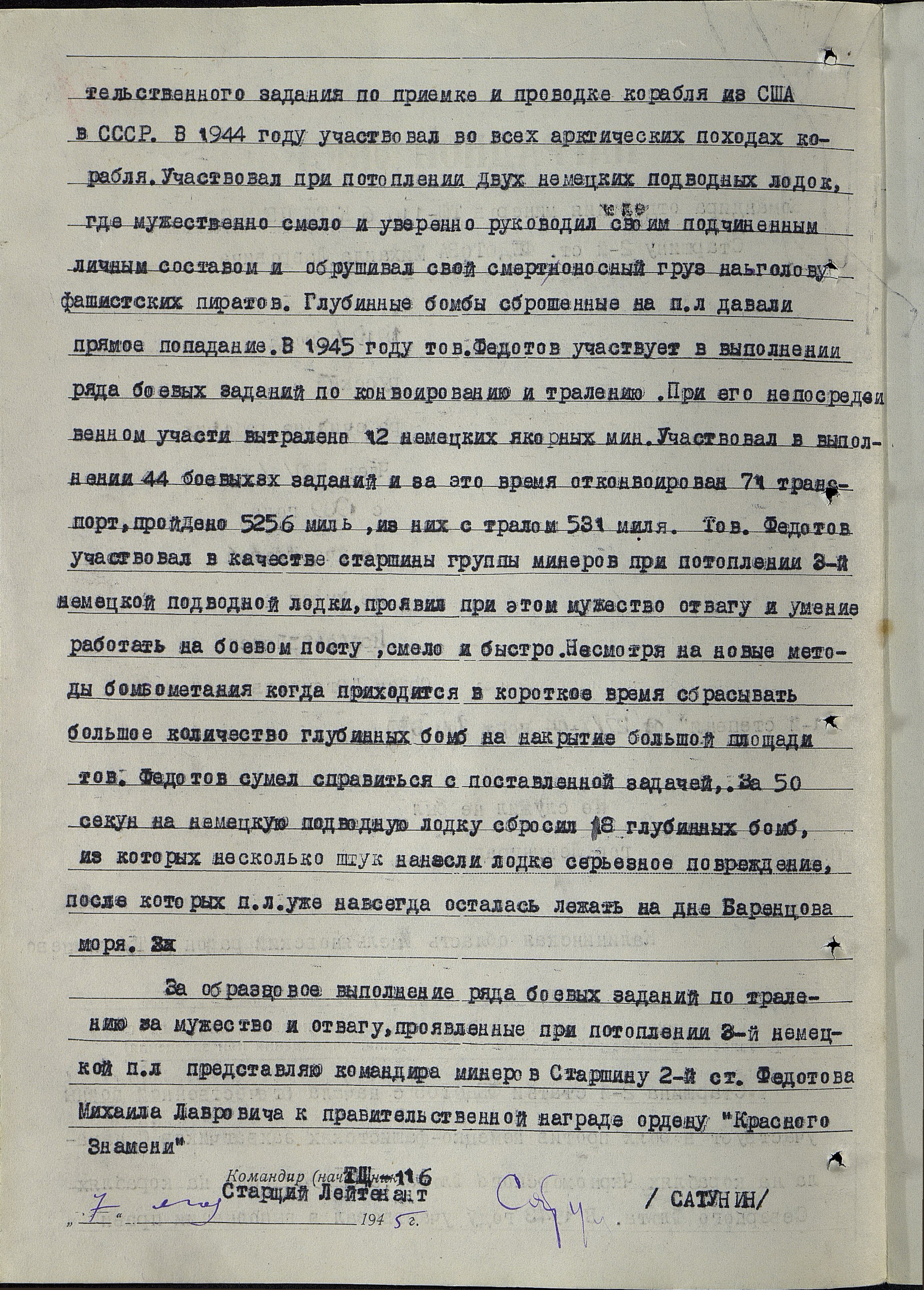 Участие в походах, награждения и отличия: десантные операции, 17.09.1942 г.; переход США-СССР, 1943 г.; арктические плавания, 1944 г.; бои Пл Пл противника, 1944-1945 г.г.; Орден «Отечественной войны» 1 степени, 27.10.1944 г.; орден «Красной Звезды», 27.05.1945 г.; медаль «За оборону Советского Заполярья», 05.12.1944 г.