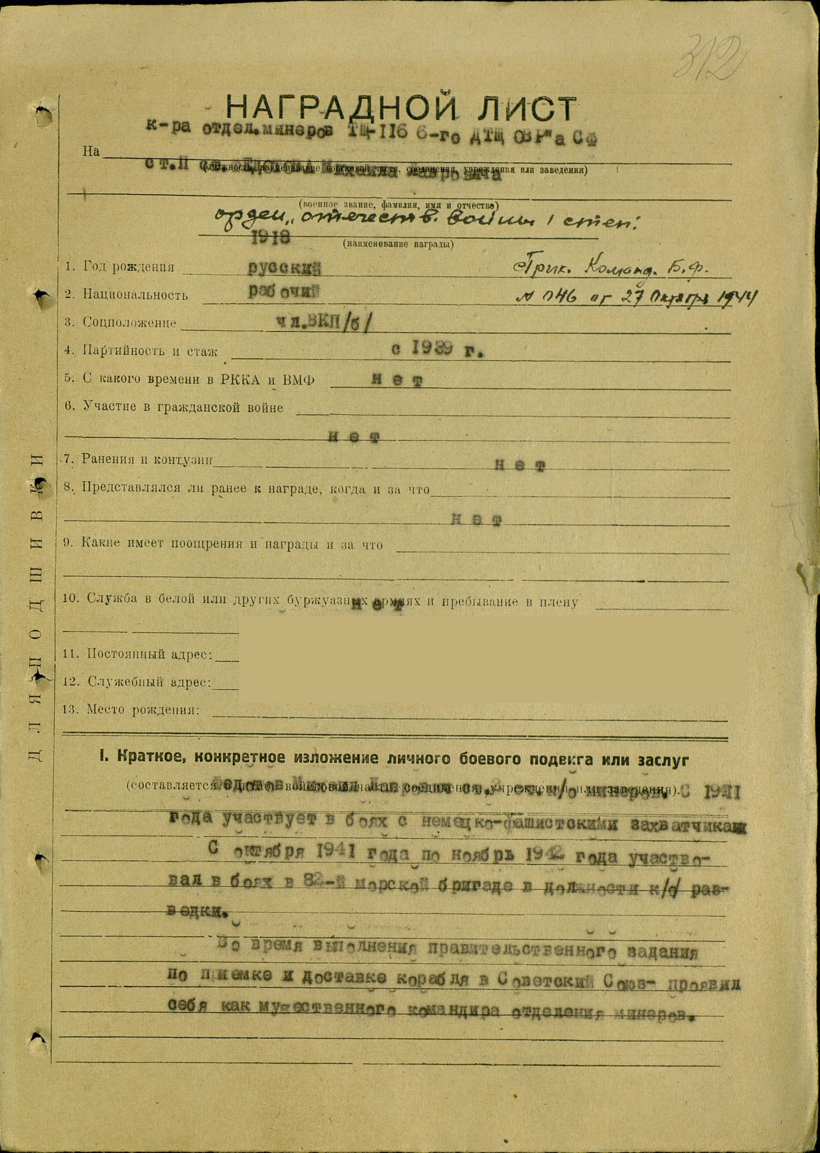 Некоторые биографические данные. Год рождения - 1919, национальность - русский, образование - 8 классов, год призыва в армию - 1939 год.